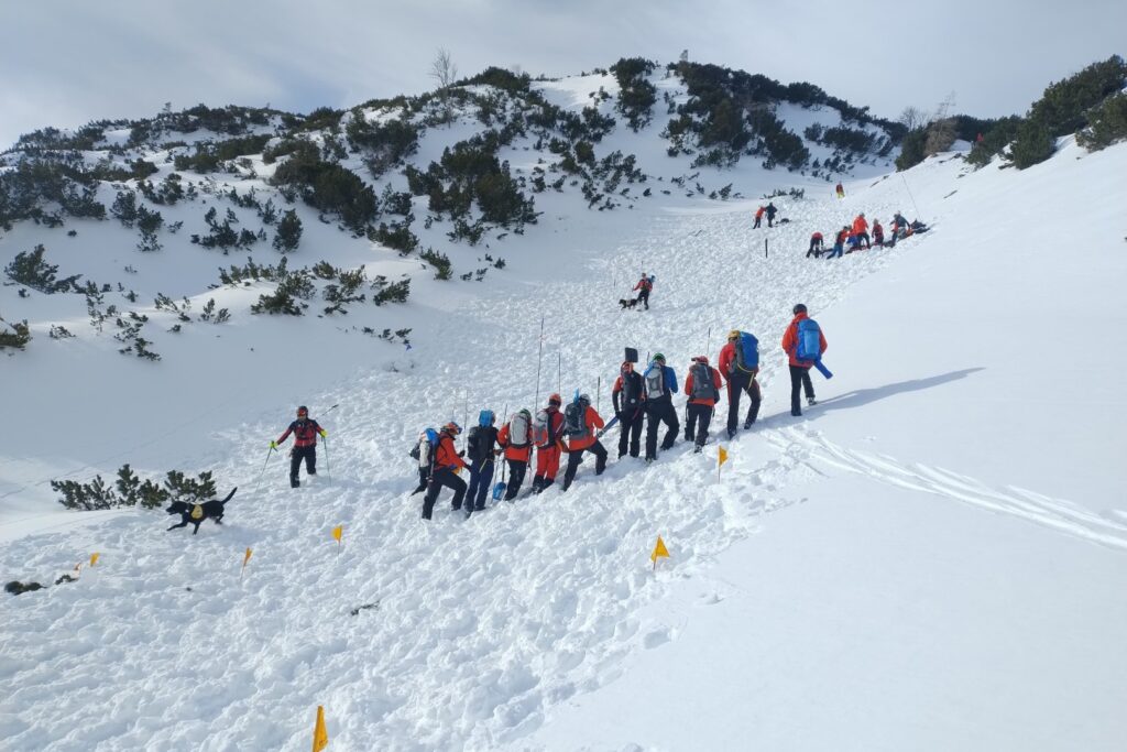 Der Stoßtrupp erreichte als erstes den Lawinenkegel und startete unmittelbar mit der Suche nach den Verschütteten. Mithilfe der erfahrenen Rettungshunde und mittels LVS-Suche konnten die Opfer rasch lokalisiert werden. Besonders herausfordernd war jedoch die Suche nach dem Opfer, welches kein LVS-Gerät trug. Hier kam eine Sondierungskette zum Einsatz, wodurch die verschüttete Person erfolgreich lokalisiert werden konnte.