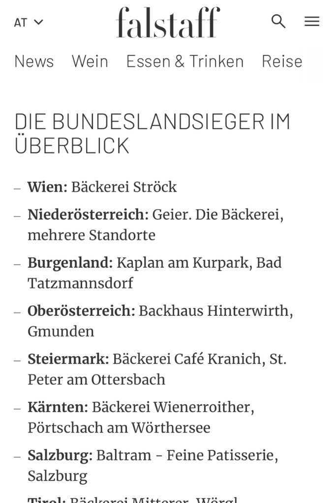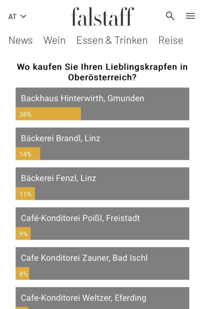 Die Falstaff-Auszeichnung basiert auf einer großen Publikumswahl, bei der Feinschmecker und Genießer aus ganz Oberösterreich ihre Lieblingskrapfen küren. Dank der treuen Stimmen unserer Kundinnen und Kunden konnten wir diesen Titel erneut verteidigen.