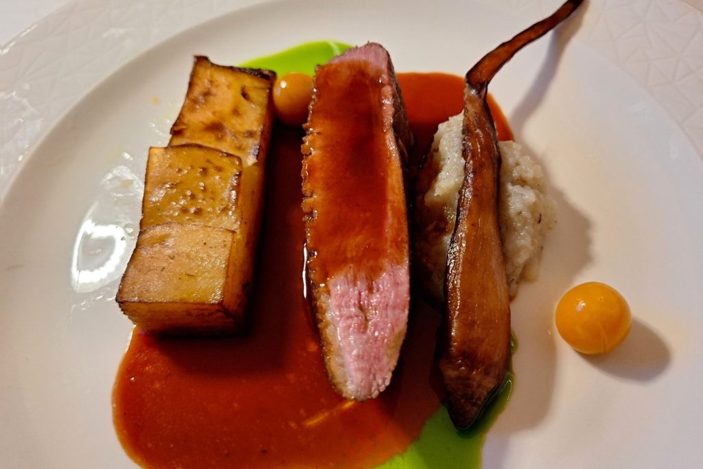 Nach den erwähnten Entrées folgten eine Bisque (eine pürierte Suppe aus Hummern und weiteren Krustentieren) mit Grieß, Mango, Erbse und Karfiol, gefolgt als Hauptspeise von einer rosa Ente mit Pastinake, Topinambur und Erdäpfel-Millefeuille. „Gestern 400 Garnelen schälen, des war schon an gewaltige Hakn“ meinte Koch Paul Doblhammer aus der 3. Fachschulklasse und ergänzte: „I hab immer schon gern kocht und i möchte einmal Koch werden; daran halt i mi fest“.