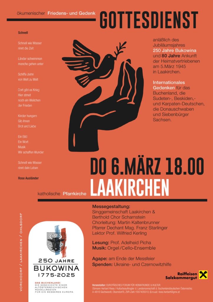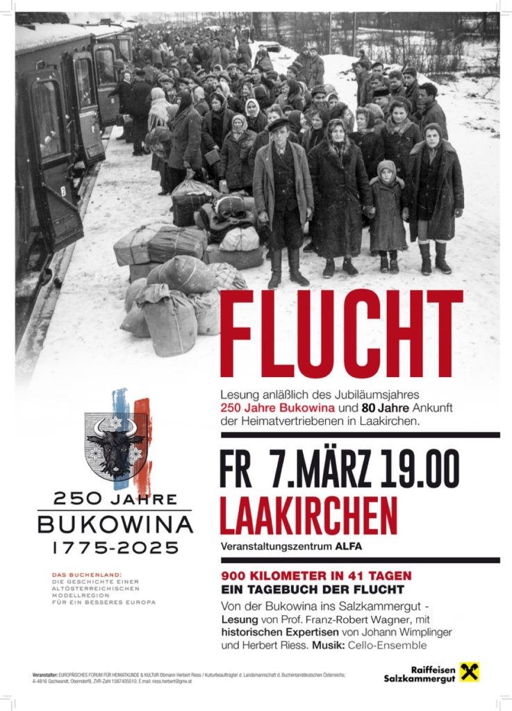 Mehr zu sehen und zu hören am 6. März 2025 um 18 Uhr bei der Gedenk- & Friedensmesse in der Pfarrkirche Laakirchen sowie am 7. März 2025 um 19 Uhr im Kulturzentrum ALFA in Laakirchen. Der Kammerschauspieler Prof. Franz-Robert Wagner verliest die Tagesereignisse aus dem Treck-Tagebuch „Flucht“, musikalisch begleitet von einem Cello-Ensemble. Dazu gibt es Expertisen vom Militärhistoriker Johann Wimplinger und Herbert Riess.
