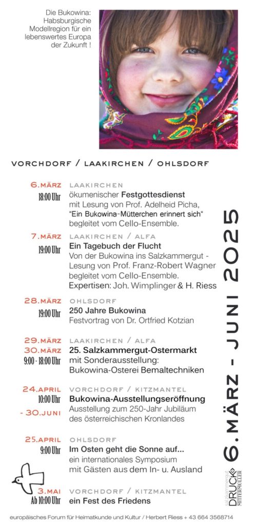 „Der Themesvarer Wasserschub“ von Hans Fuchs sowie Herbert Riess familienbedingt am „Buchenland/Bukowina, Besiedlung – Umsiedlung – Evakuierung – Flucht“. Beide Projekte erwähnen das Salzkammergut als Ausgangspunkt. Gemeinsam mit noch 2 Partnern gründeten sie im Jänner dieses Jahres den Verein „Europäisches Forum für Heimatkunde und Geschichte“ und starten ab 6. März 2025 mit 7 Veranstaltungen.