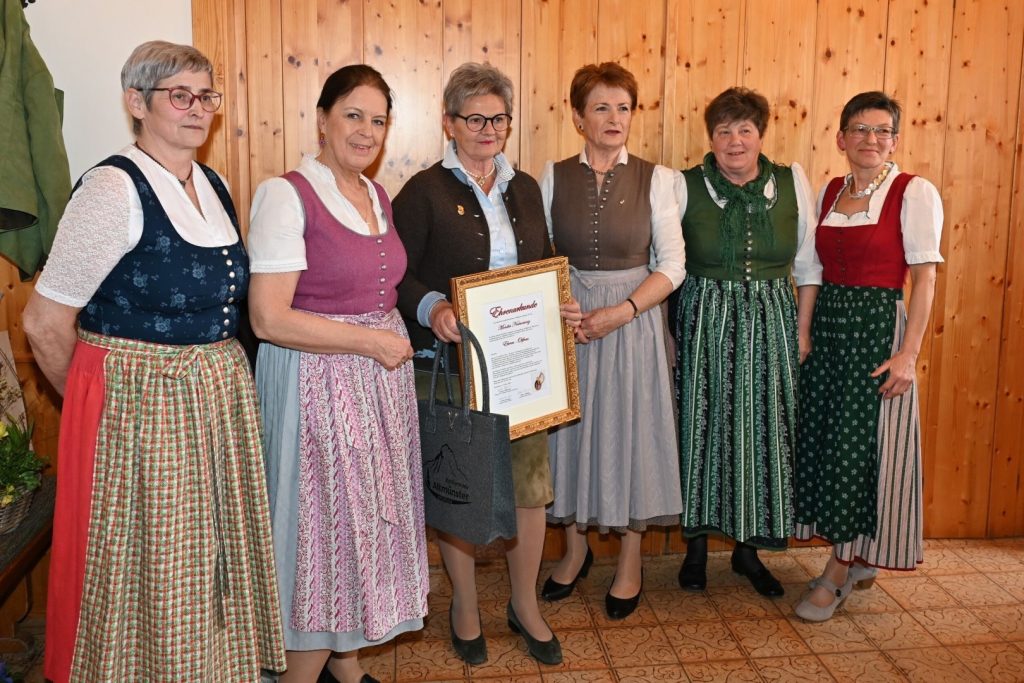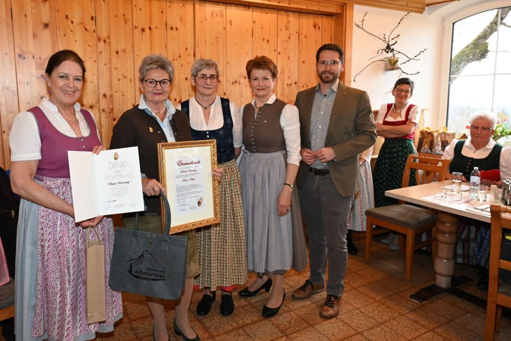 Eine große Altmünsterin wurde geehrt: Monika Natmessnig erhielt die Auszeichnung zur Ehrenobfrau der Goldhauben Altmünster. Nach 18 Jahren als Obfrau übergab sie 2024 ihr Amt an Renate Pfifferling, die nun die Leitung der Brauchtumsgruppe übernimmt.