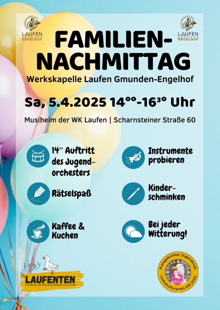 Neben einem Live-Auftritt des „Laufenten“-Jugendorchesters dürfen sich Besucher:innen auch auf Kinderschminken und Rätselspaß sowie auf Kaffee & Kuchen freuen. Mit dabei ist „Laufenten Lotti“, eine Stofftierente auf Instrumentenfindung, die als Maskottchen des Laufentenclubs Kinder von der musikalischen Früherziehung bis in das Orchester begleitet. Im Laufenten-Jugendclub wird Kindern ab dem Kindergartenalter Blockflötenunterricht und musikalische Früherziehung in einer Vereinsgemeinschaft mit viel Spiel und Spaß geboten. Die Laufenten-Kinder treffen sich einmal im Monat an einem Freitagnachmittag im Vereinsheim der Werkskapelle zu Themenveranstaltungen mit Musikbezug. Diese Laufenten-Nachmittage sind immer für alle Kinder – unabhängig davon, ob sie bereits ein Instrument erlernen – offen. Seit März wird auch ein eigener Jugendclub für Kinder ab 10 Jahren und Jugendorchestermitglieder angeboten. Ein Einstieg oder ein Schnuppern ist jederzeit möglich. Die Teilnahme an den Laufenten-Nachmittagen ist kostenlos. Im Vorjahr wurde der „Laufentenclub“ mit dem Förderpreis des OÖ. Volkskulturpreis 2024 ausgezeichnet.