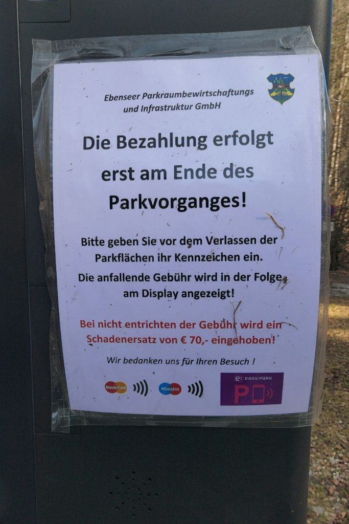 In Kürze soll auch ein Bezahlen im Nachhinein (bis zu 48 Stunden nach dem Parkvorgang) über die Webseite der Marktgemeinde Ebensee am Traunsee www.ebensee.at angeboten werden.