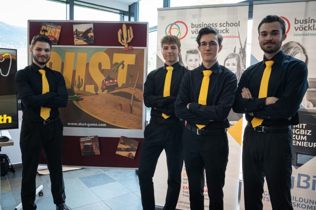 Die Business School Vöcklabruck nahm dieses Jahr zum ersten Mal am digBiz-Award teil. Diese Veranstaltung, die dieses Jahr in Sankt Johann im Pongau stattfand, prämiert die besten Diplomarbeiten der 20 digBiz-Schulen Österreichs. In den drei Kategorien „Beste Geschäftsidee“, „Bestes Design“ und „Beste Programmierung“ wurden jeweils drei Preise vergeben. Zusätzlich wurde von den 20 teilnehmenden Schulen per Online-Voting ein „Publikumspreis“ verliehen. Dabei konnten Philipp Binder, Alexander Dragov, Jonas Mieski und Kilian Schachl unter der Betreuung von Prof. Mag. Sebastian Fellner mit dem Titel „Entwicklung eines 3D-Rennspiels in Unity“ den 1. Platz in der Kategorie „Bestes Design“ und den 1. Platz beim „Publikumspreis“ erzielen. Das 3D-Rennspiel „DUST“ begeisterte nicht nur die über 500 Besucher:innen im „JO-Kultur- und Kongresshaus“ in Sankt Johann im Pongau, sondern überzeugte auch die Juroren aus der regionalen Wirtschaft. Dir. Mag. Helmut Hüttmaier, der die Aussteller zu der Veranstaltung nach St. Johann im Pongau begleitete, ist überzeugt, dass dies wieder ein klarer Auftrag für die Business School Vöcklabruck sei, die Kompetenzen Wirtschaft und Technik im digBiz-Zweig zu verknüpfen.