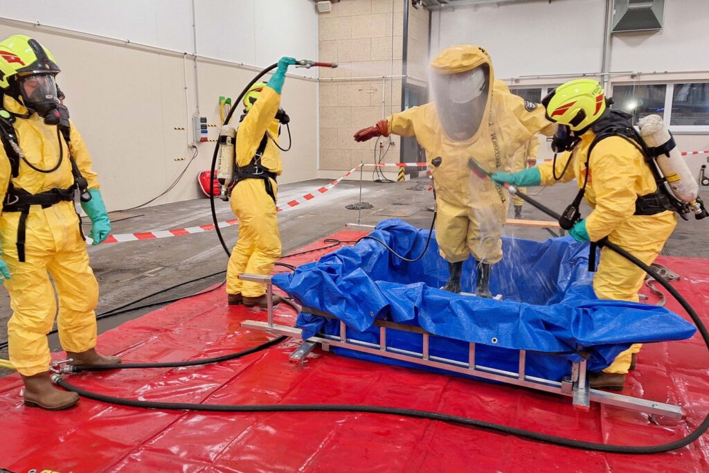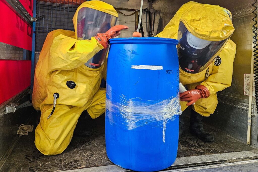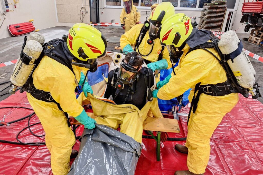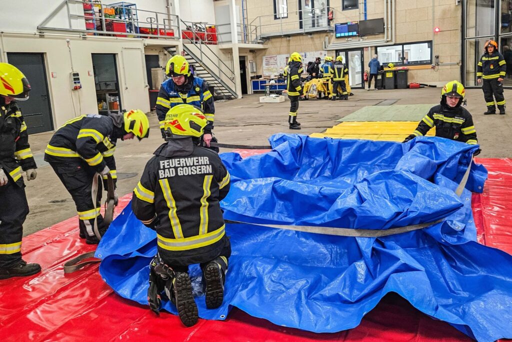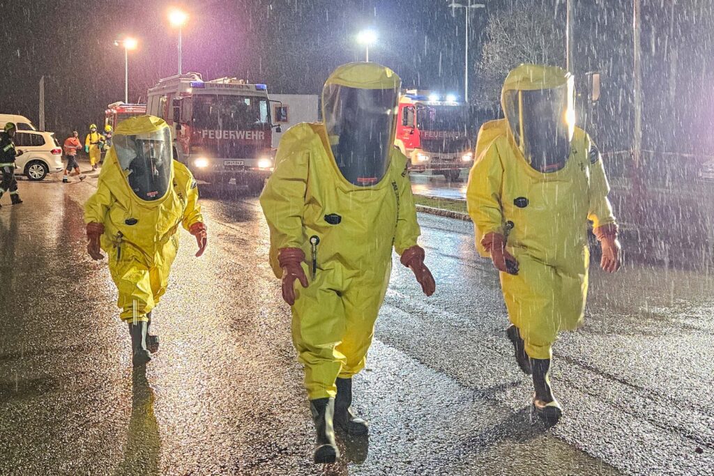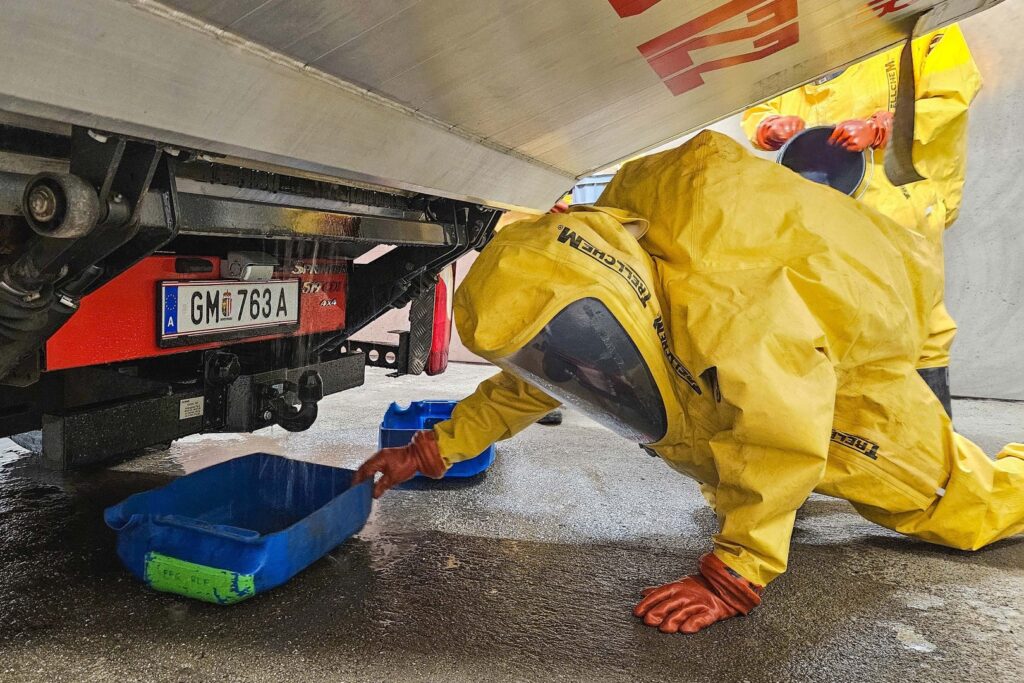 „Bei Verladearbeiten wurde ein Transportfass beschädigt, Gefahrgut läuft aus“ – so stellte sich die Ausgangslage für eine kürzliche Einsatzübung der FF Bad Goisern dar. Unter realistischen Bedingungen arbeiteten die Kräfte folglich das Szenario ab – unter Einsatz von viel „Manpower“ und vielerlei Gerätschaften. Der Gefahrenbereich wurde weiträumig abgesperrt und ausgeleuchtet sowie eine mobile Einsatzleitung aufgebaut. Nur unter speziellen, gasdichten Schutzanzügen (Schutzstufe-III) konnte folglich ein Trupp zu dem leckgeschlagenen Behältnis vordringen, die Flüssigkeit auffangen und das Fass schließlich abdichten. Doch damit nicht genug, wurde auch noch ein Not-Deko-Platz errichtet, wo stufenweise die Reinigung (Dekontamination) des eingesetzten Trupps unter speziellen Schutzmaßnahmen erfolgte. Dank der umfassenden Ausrüstung, welche im Rüstlösch- und im Atemschutzfahrzeug mitgeführt wird, und der regelmäßigen Ausbildungen in diesem Bereich, ist man bei der FF Bad Goisern auch für solch außergewöhnliche Szenarien sehr gut vorbereitet.