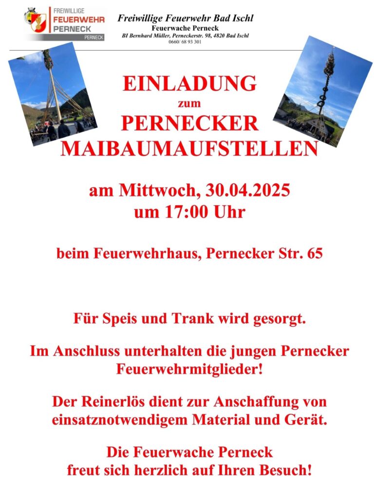 Am Mittwoch, 30. April 2025, wird auch heuer wieder in der Bad Ischler Ortschaft Perneck – direkt vor dem Feuerwehrhaus der Feuerwache Perneck – ein Maibaum aufgestellt. Beginn ist um 17:00 Uhr.