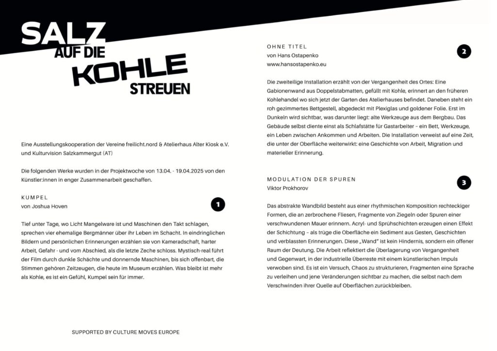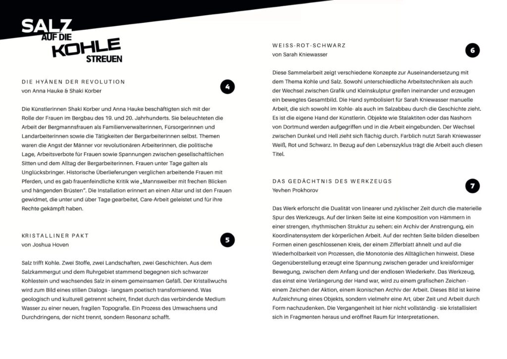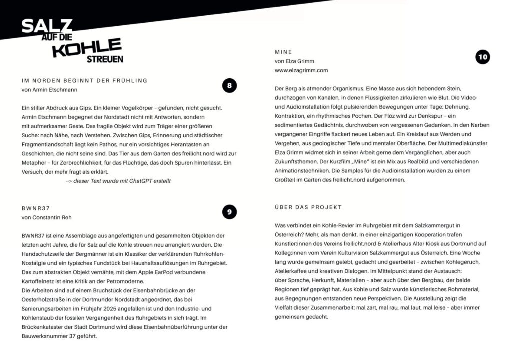 Gemeinsam mit Künstler:innen des Atelierhauses freilicht.nord wurde eine Ausstellung zum Thema Kohle und Salz erarbeitet – ein verbindendes Thema zwischen dem Salzkammergut und Dortmund, da beide Regionen stark vom Bergbau geprägt sind. Insgesamt waren zehn Künstler:innen an dem Projekt beteiligt, davon vier aus dem Salzkammergut: Armin Etschmann, Elza Grimm, Sarah Kniewasser und Shaki Korber.