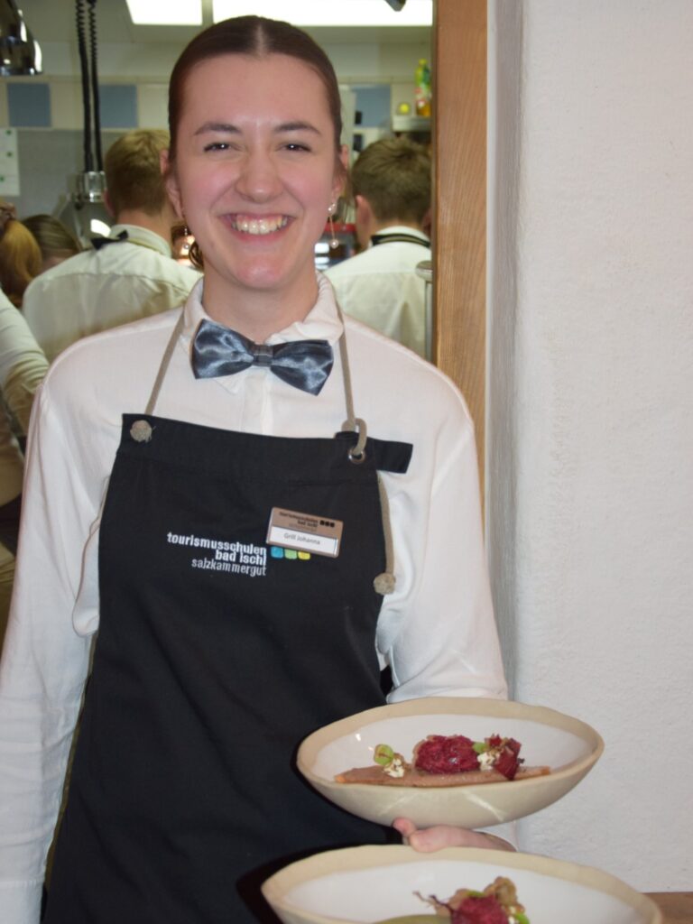 Auf Beef Tatar Cones folgten Kohlrabitascherl mit Reinanke, warm geräucherter Saibling, ein Gurken-Kren-Sorbet mit Grüll-Kaviar, als Hauptgang geschmortes „Postalm-Rind“, abgerundet durch ein ganz besonderes Dessert. „Das ist das längste Dessert der Talenteschmiede“ meinte Direktor Wolfgang Falkensteiner stolz, „denn bis zur Fertigstellung der Mousse mit Tonkabohne, Vanille und Erdbeeren hat es mit allen Arbeitsschritten 12 Stunden gedauert“. Die jungen Gastrotalente hatten gemeinsam mit Marlies Nahmer (Servicelehrerin) und Lorenz Pesendorfer (Küche) nicht nur ungezählte Stunden ihrer Freizeit, sondern auch eine riesige Portion Herzblut in die Realisierung dieses Abends gelegt, wie Fachvorstand Günter Gaderbauer zufrieden feststellen konnte. Das Publikum spürte diese Begeisterung vom Gruß aus der Küche bis zum Dessert.