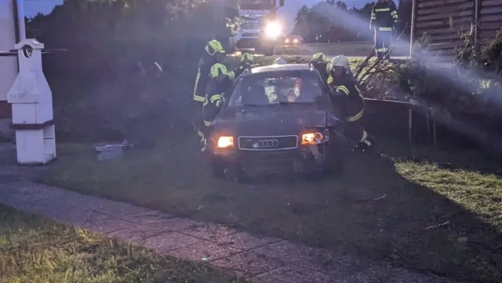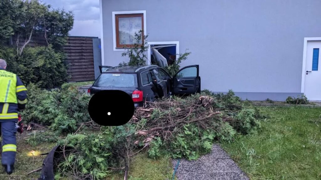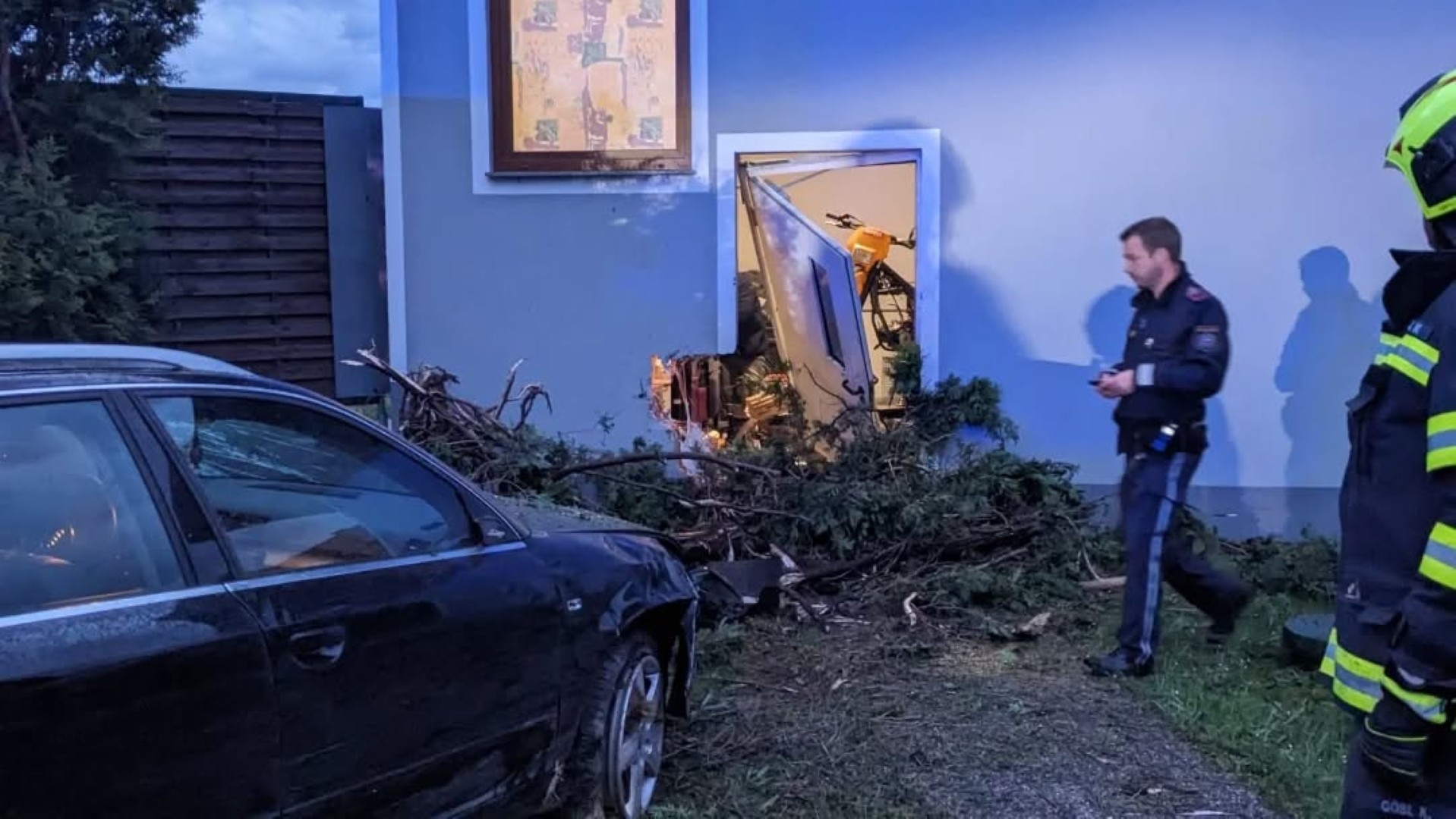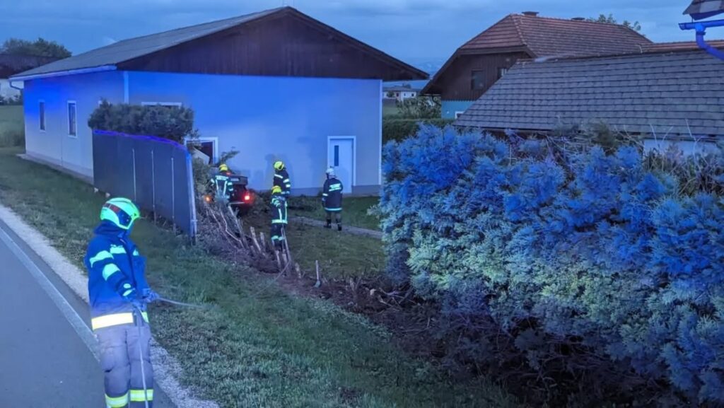 In Rüstorf ist Freitagabend ein Auto von der B135 Gallspacher Straße abgekommen, durch eine Hecke in einen Garten gerast und an einer Hausmauer zum Stillstand gekommen.