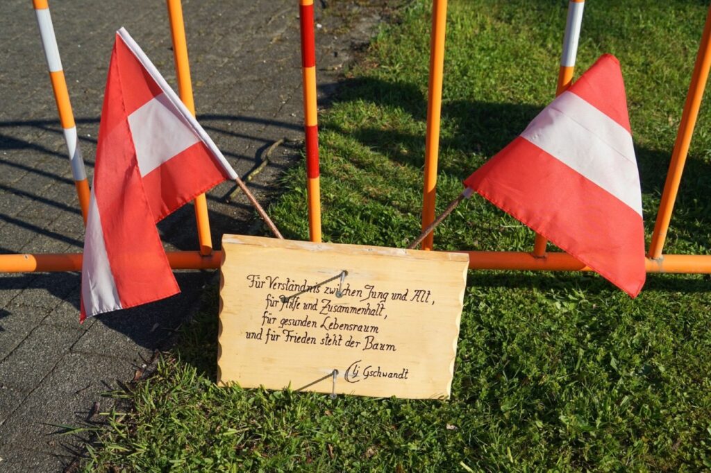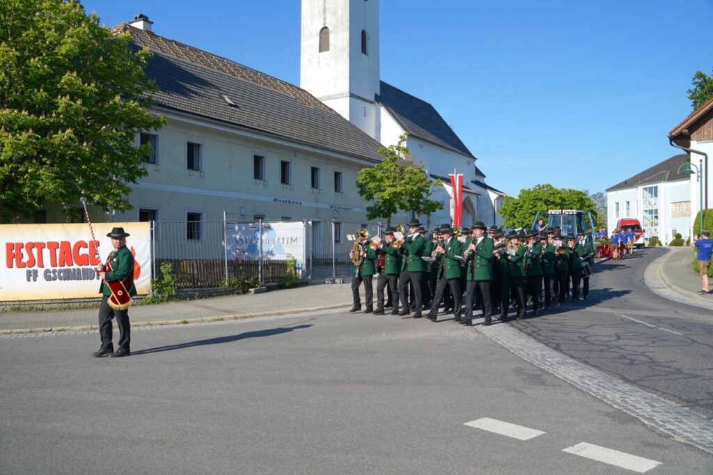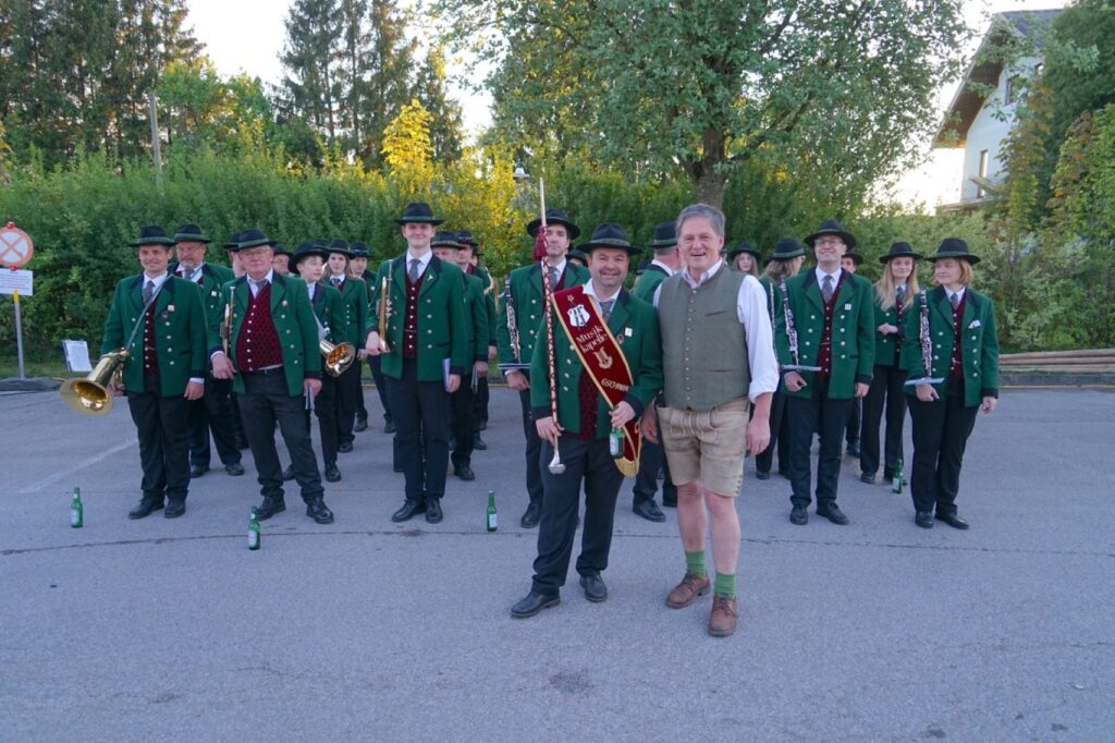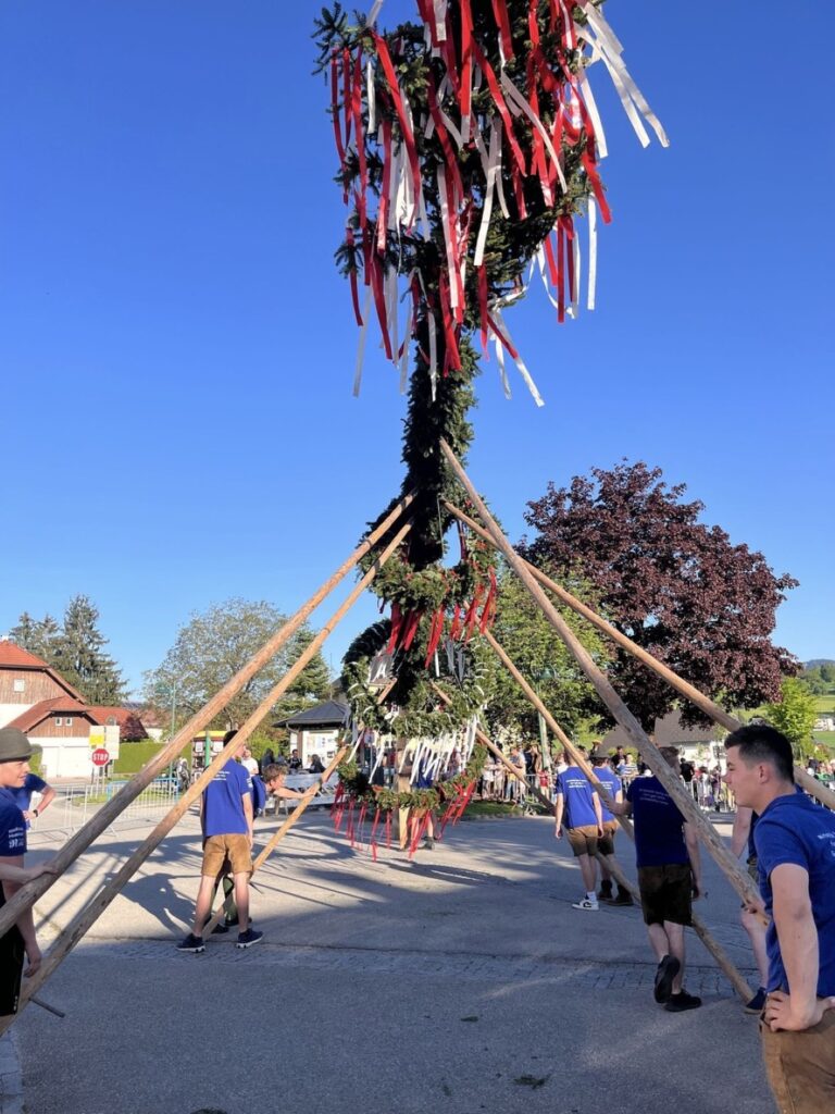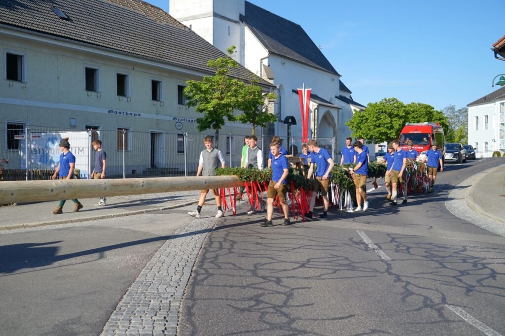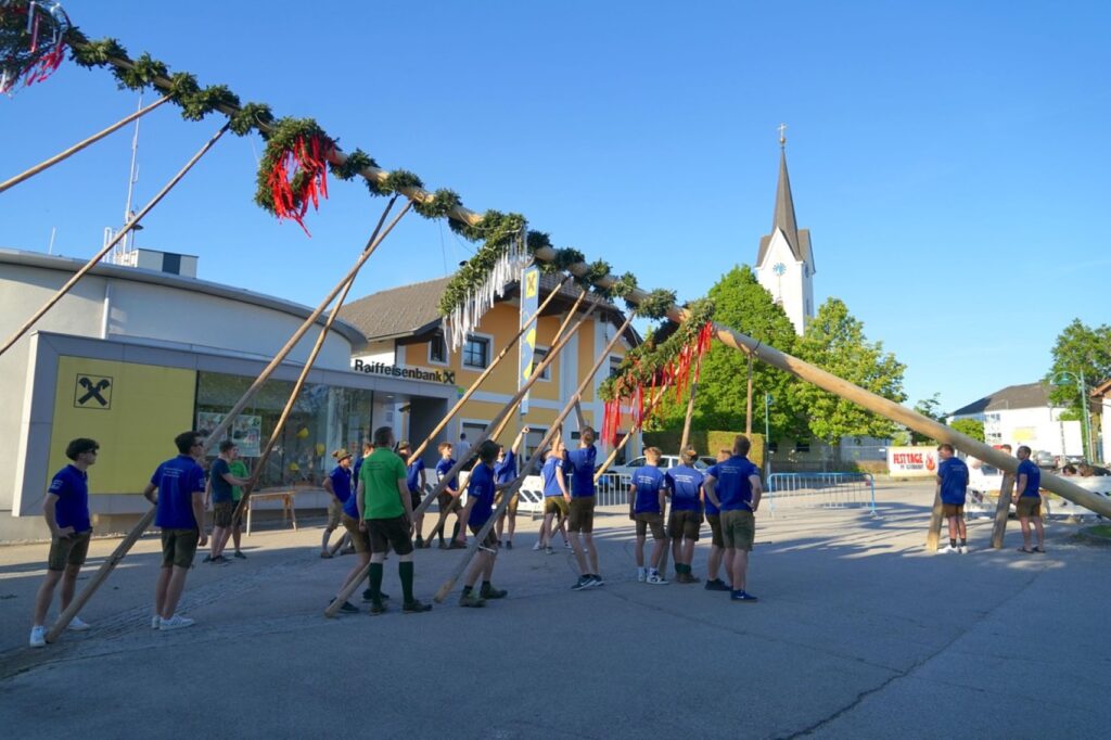 Wie jedes Jahr wurde auch am 30.4.2025 ein Maibaum aufgestellt. Dieses Jahr war wieder die Landjugend Gschwandt an der Reihe. Der Maibaum wurde in liebevoller Arbeit mit Kränzen geschmückt und dann auf den Parkplatz Gschwandt im Ortszentrum gebracht. Mit dem Musikverein Gschwandt voran kam der Maibaum dort an und da warteten schon ungeduldig hunderte Gschwandtnerinnen und Gschwandtner, die den Maibaumzug mit Applaus empfingen. Mit Hilfe von Stangen wurde dann der Maibaum Stück für Stück gehoben. Eine schweißtreibende Arbeit, die Geduld und Genauigkeit fordert. Mit Musik geht alles besser und so spielte die Musikkapelle Gschwandt laufend beim Aufstellen.