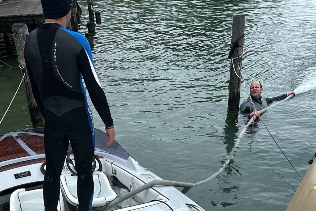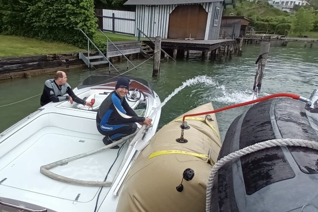 Die Österreichische Wasserrettung Ortsstelle Nußdorf wurde zu einer Bergung eines Elektrobootes gerufen, dass an einem Steg in Attersee gesunken war.