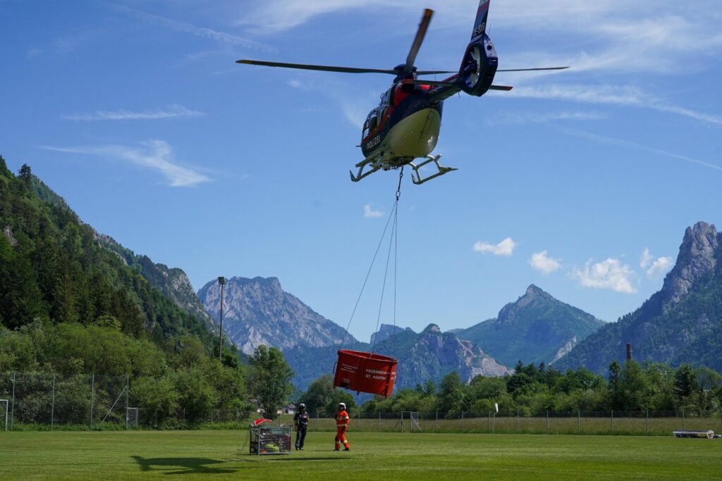 Vom ASKÖ-Sportplatz Ebensee aus transportierten Hubschrauber Personal und Gerät auf den Berg, darunter auch einen Löschwasserbehälter. Für die Versorgung mit Löschwasser errichteten die Feuerwehrzüge eine fast 4 Kilometer lange Relaisleitung mit über 500 Höhenmetern – ein herausforderndes Unterfangen, das erfolgreich umgesetzt wurde.