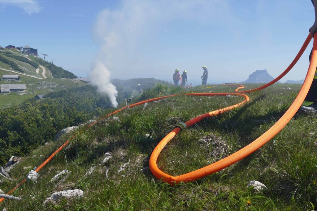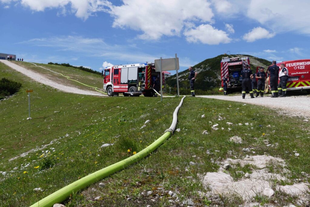 Gegen 7 Uhr wurden die vier Feuerwehren des Pflichtbereichs Ebensee zu einem angenommenen Waldbrand nahe der Bergstation der Feuerkogel-Seilbahn alarmiert. Das Übungsszenario: Ein ausgedehnter Brand eines Latschenfeldes in rund 1.600 Meter Seehöhe, zusätzlich ein schwer erreichbares Feuer am benachbarten Langwandkogel, welches durch Funkenflug entfacht wurde.