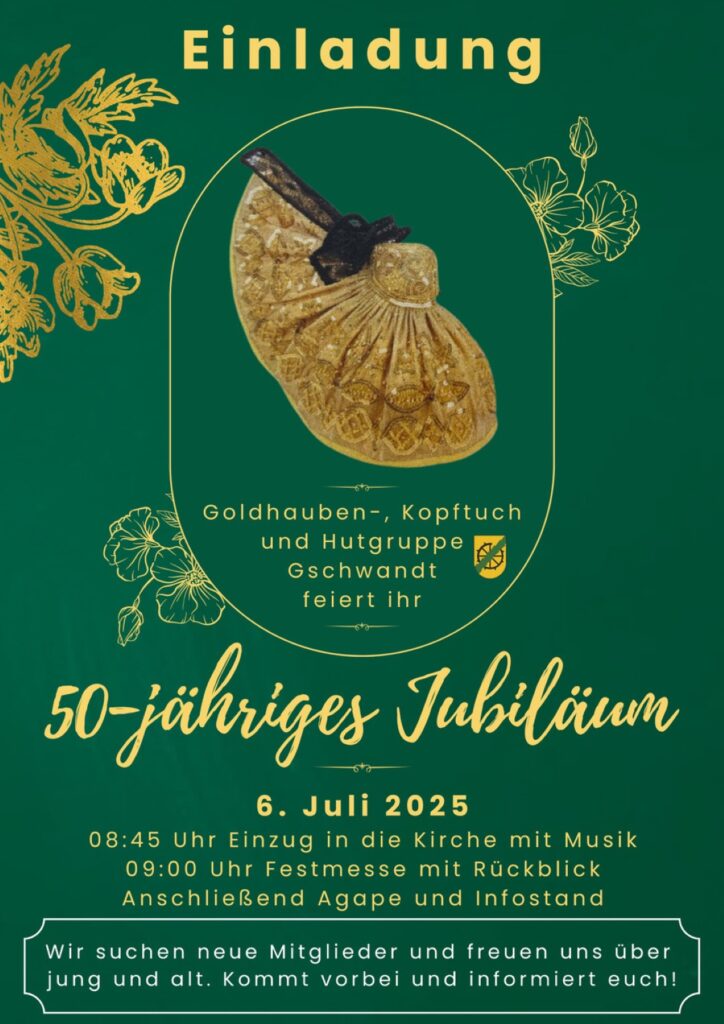 Mit einem Einzug in die Pfarrkirche Gschwandt beginnt am Sonntag 6. Juli 2025 um 8:45 Uhr das große Fest zum 50 Jahre Jubiläum der Goldhauben- Kopftuch- und Hutgruppe Gschwandt. Der Festgottesdienst wird musikalisch begleitet. In der Festmesse wird auch ein Rückblick über die 50 Jahre dieses regen Vereines vorgetragen. Nach der Messe gib es eine Agape mit Infostand, wo die Mitglieder gerne Fragen und Antworten geben werden.