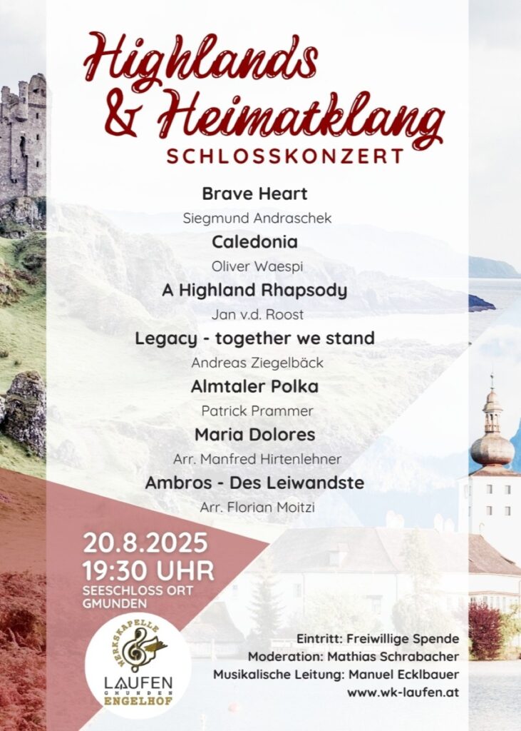 Die Werkskapelle nimmt ihr Publikum unter der musikalischen Leitung von Kapellmeister Manuel Ecklbauer am diesjährigen Schlosskonzert mit auf eine klangvolle Reise durch verschiedene musikalische Landschaften. Mit Werken wie „Brave Heart“ von Siegmund Andraschek, „Caledonia“ von Oliver Waespi und „A Highland Rhapsody“ von Jan van der Roost wird die raue Schönheit Schottlands musikalisch eingefangen. Gleichzeitig schlägt das Ensemble mit „Legacy – together we stand“, einer Auftragskomposition des ehemaligen Kapellmeisters Andreas Ziegelbäck anlässlich der Probenheim-Eröffnung, den Bogen zur eigenen musikalischen Heimat und Gemeinschaft.