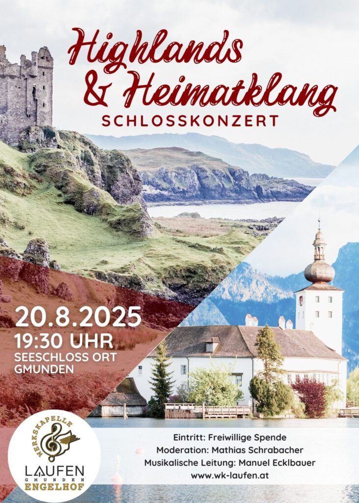 Gmunden/Seeschloss Ort. Die Werkskapelle Laufen Gmunden-Engelhof lädt am Mittwoch, 20. August 2025, zum diesjährigen Schlosskonzert ins stimmungsvolle Ambiente des Seeschloss Ort. Unter dem Motto „Highlands & Heimatklang“ erwartet die Konzertbesucherinnen und -besucher ein musikalisches Programm, das Brücken schlägt – von den mystischen Weiten der schottischen Highlands bis hin zum neuen Musikheim der Werkskapelle. Der Neubau in der Scharnsteiner Straße 60 wurde im Mai 2025 feierlich eröffnet und bietet dem Orchester und dem Jugendprogramm, dem Laufenten-Jugendclub, ein modernes Zuhause sowie hervorragende Rahmenbedingungen für die musikalische Entwicklung.