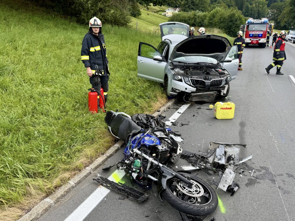 Am Samstagmittag kollidierte auf der B154 Mondsee Straße ein Motorrad mit einem Pkw. Der Motorradlenker wurde dabei schwer verletzt und mit dem Notarzthubschrauber ins Krankenhaus geflogen.