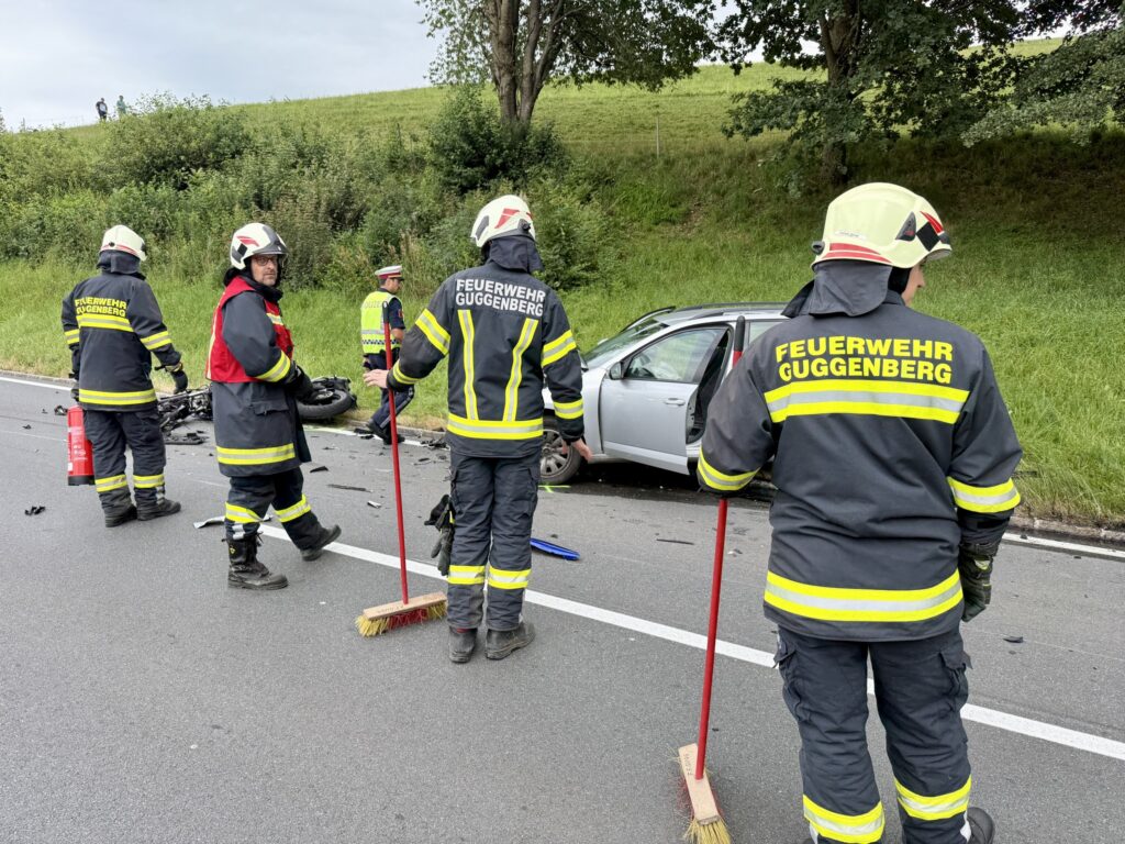 Die Freiwillige Feuerwehr Guggenberg wurde am Samstag, 23. August 2025, um 13:00 Uhr zu einem Verkehrsunfall „Motorrad gegen Pkw“ auf Höhe Irrseeblick alarmiert. Beim Eintreffen wurde der Motorradlenker bereits durch den Notarzt des Notarzthubschraubers C6, einen örtlichen Notarzt und das Rote Kreuz Mondsee versorgt. Der Pkw-Lenker blieb unverletzt.