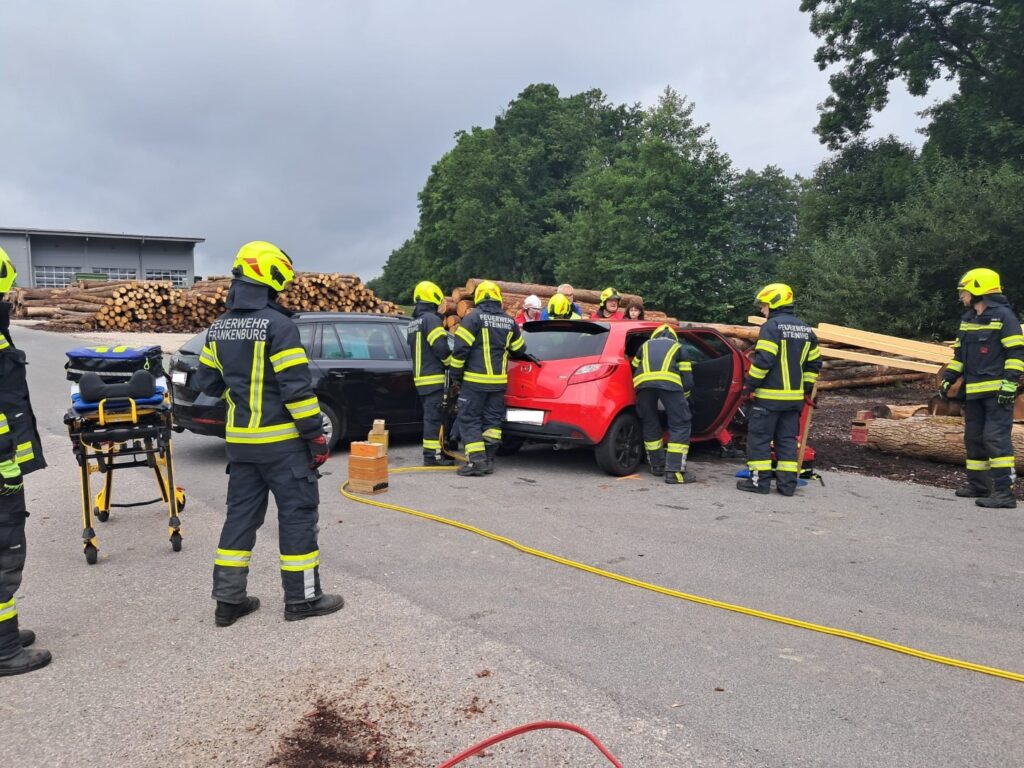 Die Fahrzeuge stießen rechtwinkelig zusammen und kamen auf der Fahrbahn zum Stillstand. Der 29-Jährige, seine Beifahrerin sowie der 23-jährige Beifahrer konnten die Unfallfahrzeuge selbstständig verlassen. Die 59-Jährige hingegen wurde im Fußbereich eingeklemmt und musste von der Feuerwehr mit der Bergeschere aus dem Fahrzeug befreit werden.