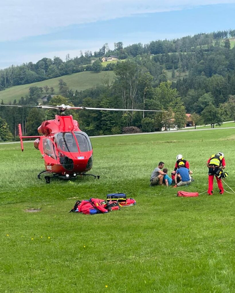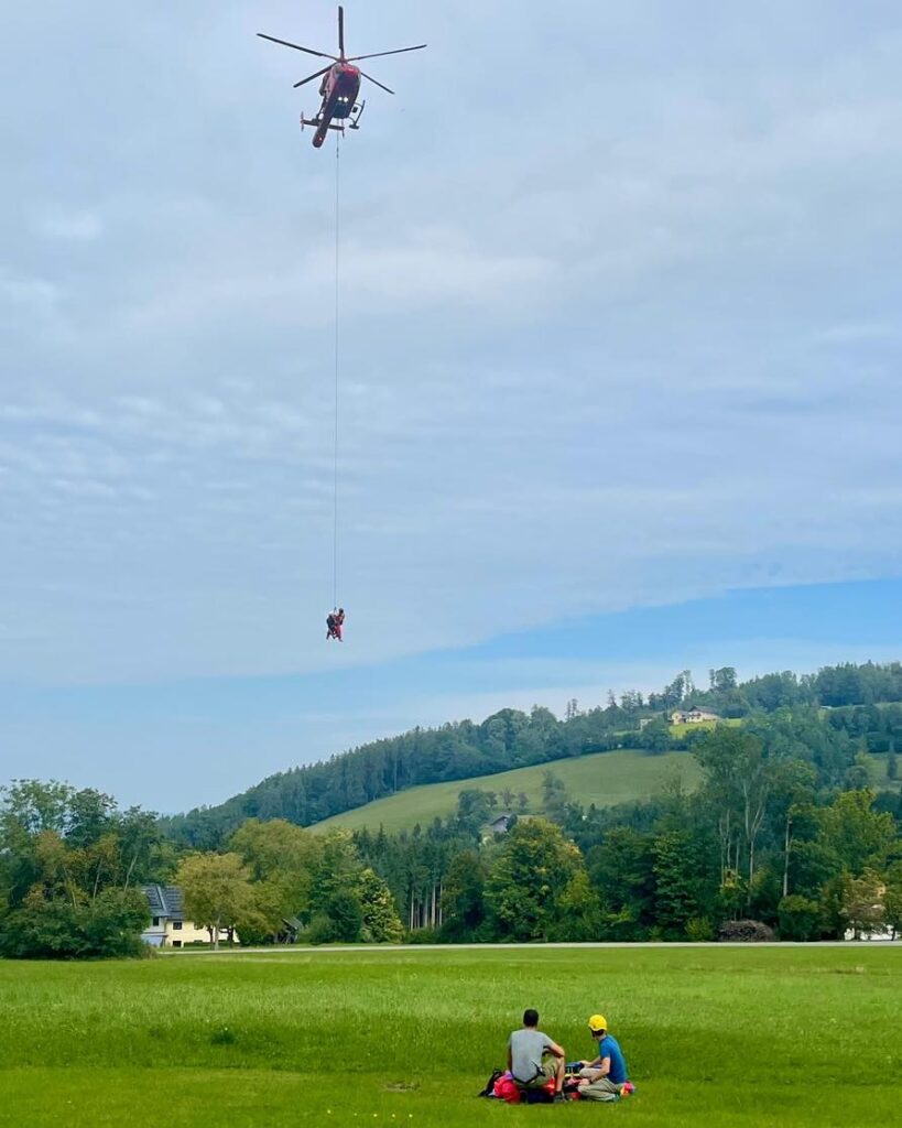 Am Dienstag kam es wiederum am Grünberg, auf der ehemaligen Skipisten, zu einem landwirtschaftlichen Unfall, wobei ein Traktor bei Mäharbeiten ins Rutschen kam und der Lenker sich durch einen Sprung aus dem Fahrzeug rettete. Dabei verletzte er sich schwer am Bein. Der Mann wurde vom Notarzthubschrauber „Martin 3“ per Tau gerettet und zum Zwischenlandeplatz geflogen. Nach der weiteren Versorgung wurde er ins Krankenhaus Vöcklabruck gebracht, berichtet die Bergrettung Gmunden.