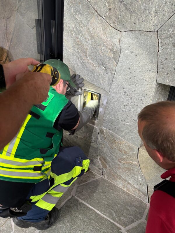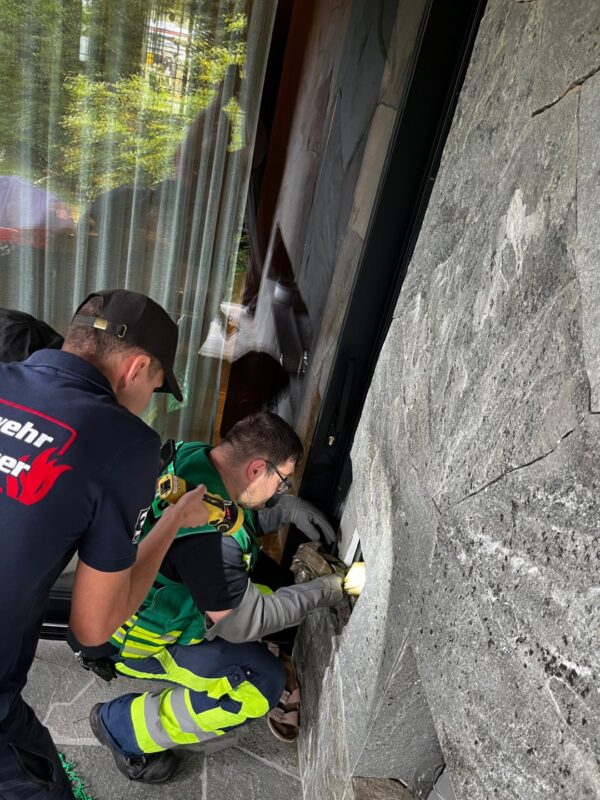 Der Einsatz begann mit einer gründlichen Lagebesichtigung. Zunächst war nur durch ein kleines Wartungstürchen sichtbar, dass der imposante Greifvogel in der engen Öffnung gefangen war. Die Feuerwehr entschied daher, die Tierrettung Oberösterreich aus Lindach zur Unterstützung hinzuzuziehen. Gemeinsam wurde überlegt, welche Methoden für eine sichere Bergung in Frage kommen.