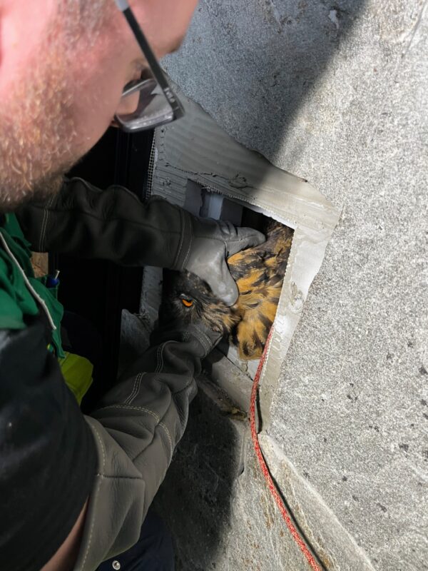 Die Rettungsaktion dauerte fast zwei Stunden. Mehrfach versuchte man zunächst, den Uhu vorsichtig nach oben hinauszuführen. Als dies nicht gelang, entschieden sich die Einsatzkräfte, die Öffnung beim Kamintürchen mit Spezialwerkzeugen vorsichtig zu erweitern.