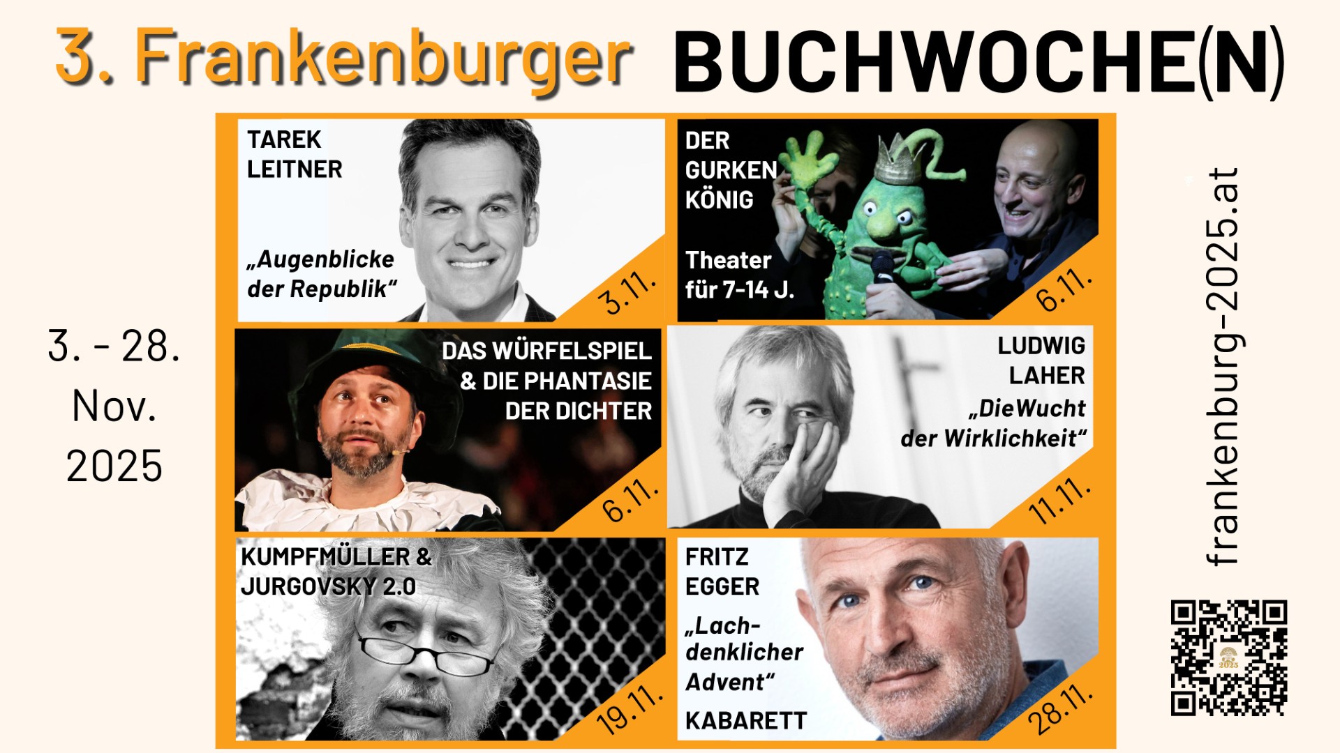 Ludwig Laher ist bekannt für seine zeitkritisch-historischen Romane, denen immer reale Vorkommnisse zugrunde liegen. Am Dienstag, 11. November, spricht er im Frankenburger Pfarrsaal über „Die Wucht der Wirklichkeit“ und beleuchtet dabei auch markante Punkte in der Geschichte unserer Region (Beginn 19.30 Uhr). Heiter und beschwingt geht es dann am Mittwoch, 19. November beim PreunerWirt zu, wenn sich der Innviertler Mundartkünstler Hans Kumpfmüller und der Frankenburger Tastenvirtuose Marcel Jurgovsky ein zweites Mal nach 2023 live on stage ein Stelldichein geben (19.30 Uhr). Den Abschluss der Buchwochen gestaltet der Theatermacher Fritz Egger, der am Freitag, 28.11. um 20 Uhr beim PreunerWirt mit seinem kongenialen Musik-Partner Johannes Pillinger Kabarett spielt. Das Programm heißt „Lachdenklicher Advent“.