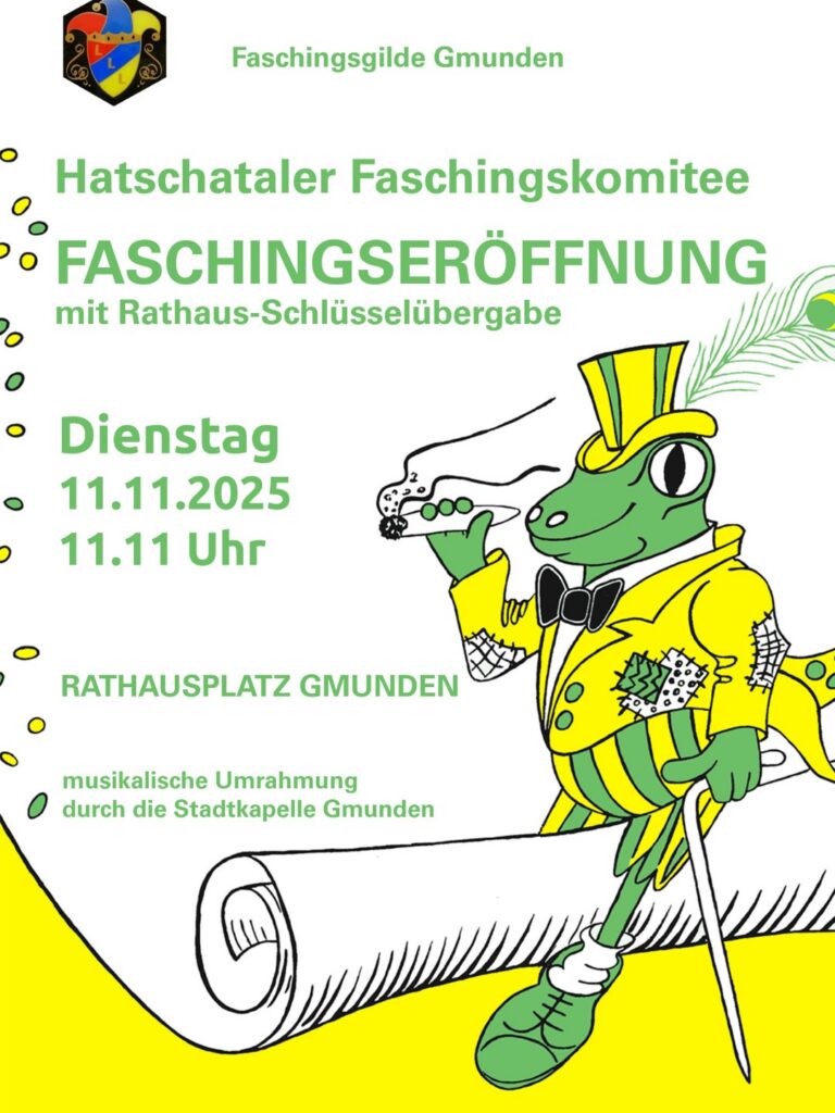 Das Hatschataler Faschingskomitee und die Faschingsgilde Gmunden laden gemeinsam mit der Stadtgemeinde Gmunden zur Faschingseröffnung mit Schlüsselübergabe durch Herrn Bgm. Mag- Stefan Krapf am Dienstag, 11.11.25 um 11.11 Uhr vor das Gmundner Rathaus ein.