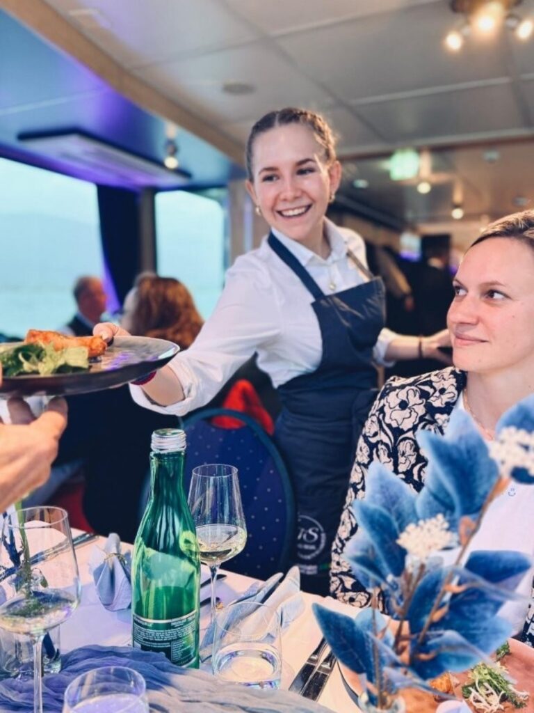 Die Veranstaltung begann an der Schafberg-Anlegestelle, wo die SchülerInnen mit Laugenkipferl, Ox-Tatar, Senf-Knoblauchaioli, Röstzwiebel, Saiblingrilettepalas mit Kaviar und Schnittlauch aufwarteten. Dazu gab es Aperol Sour und auch eine alkoholfreie Version wurde offeriert.