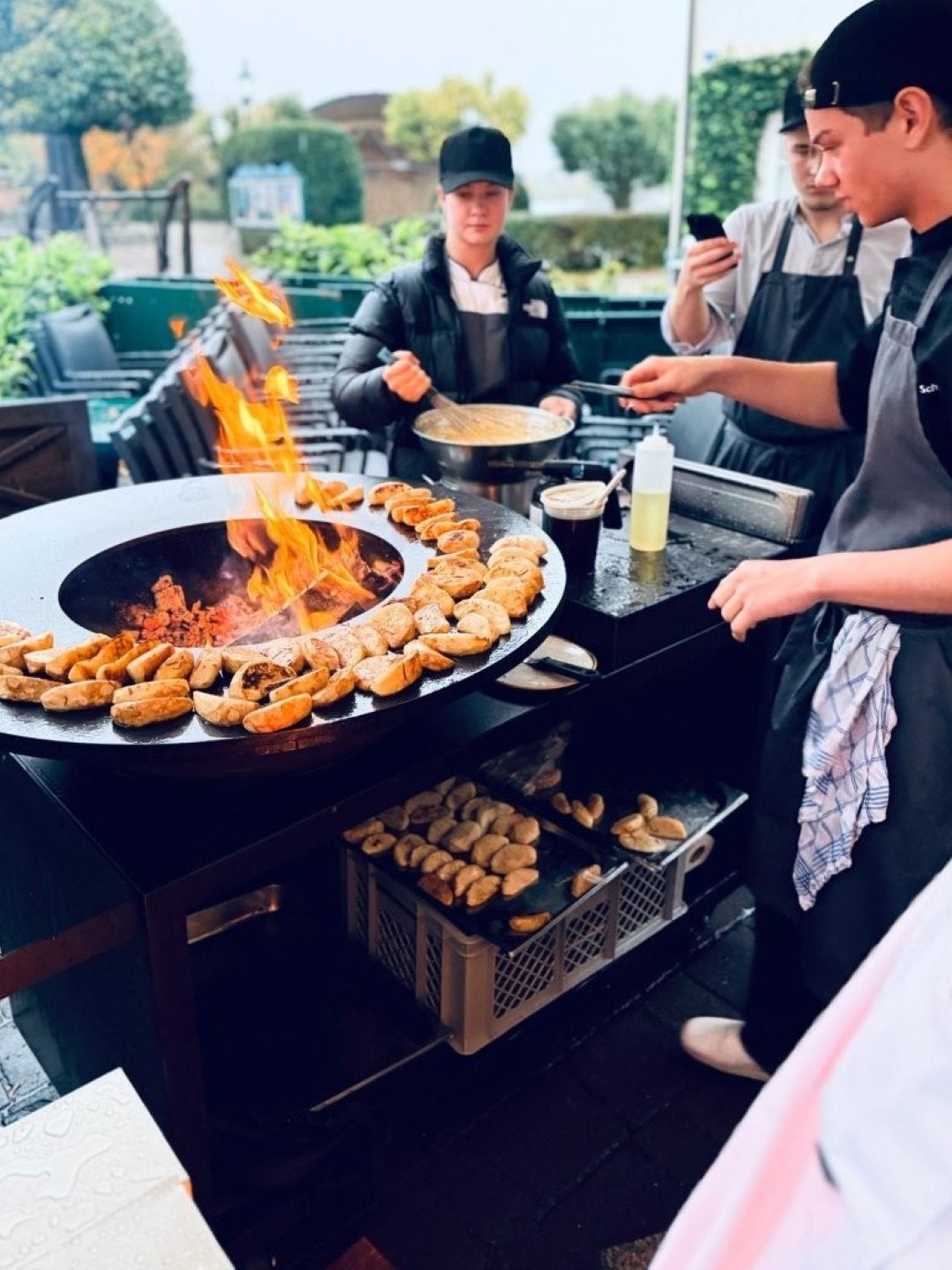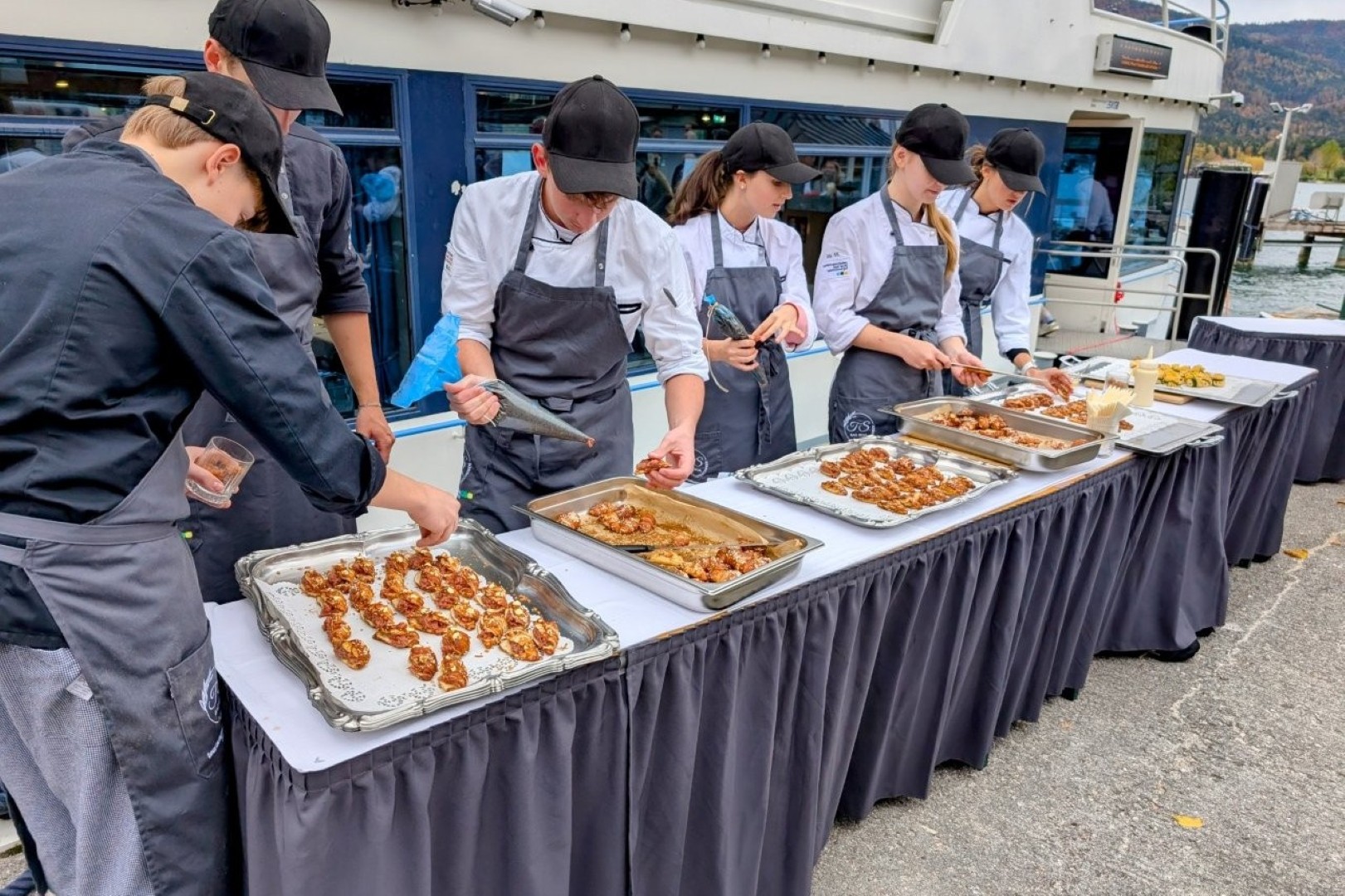 Die Veranstaltung begann an der Schafberg-Anlegestelle, wo die SchülerInnen mit Laugenkipferl, Ox-Tatar, Senf-Knoblauchaioli, Röstzwiebel, Saiblingrilettepalas mit Kaviar und Schnittlauch aufwarteten. Dazu gab es Aperol Sour und auch eine alkoholfreie Version wurde offeriert.