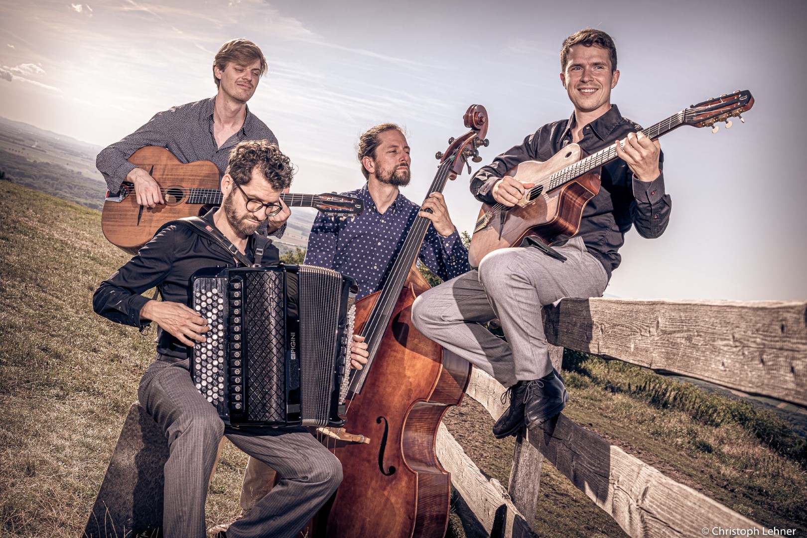 Ergänzt von Julian Wohlmuth an der Rhythmusgitarre und Matin Heinzle am Komtrabass, verzaubert das Quartett mit erfrischendem „Alpin-Swing“ – einer gelungenen Mischung aus Gypsy-Swing, Balkan-Jazz und neuer Volksmusik, die das Publikum turbulent wie auch sanft durch den Abend schweben lässt…