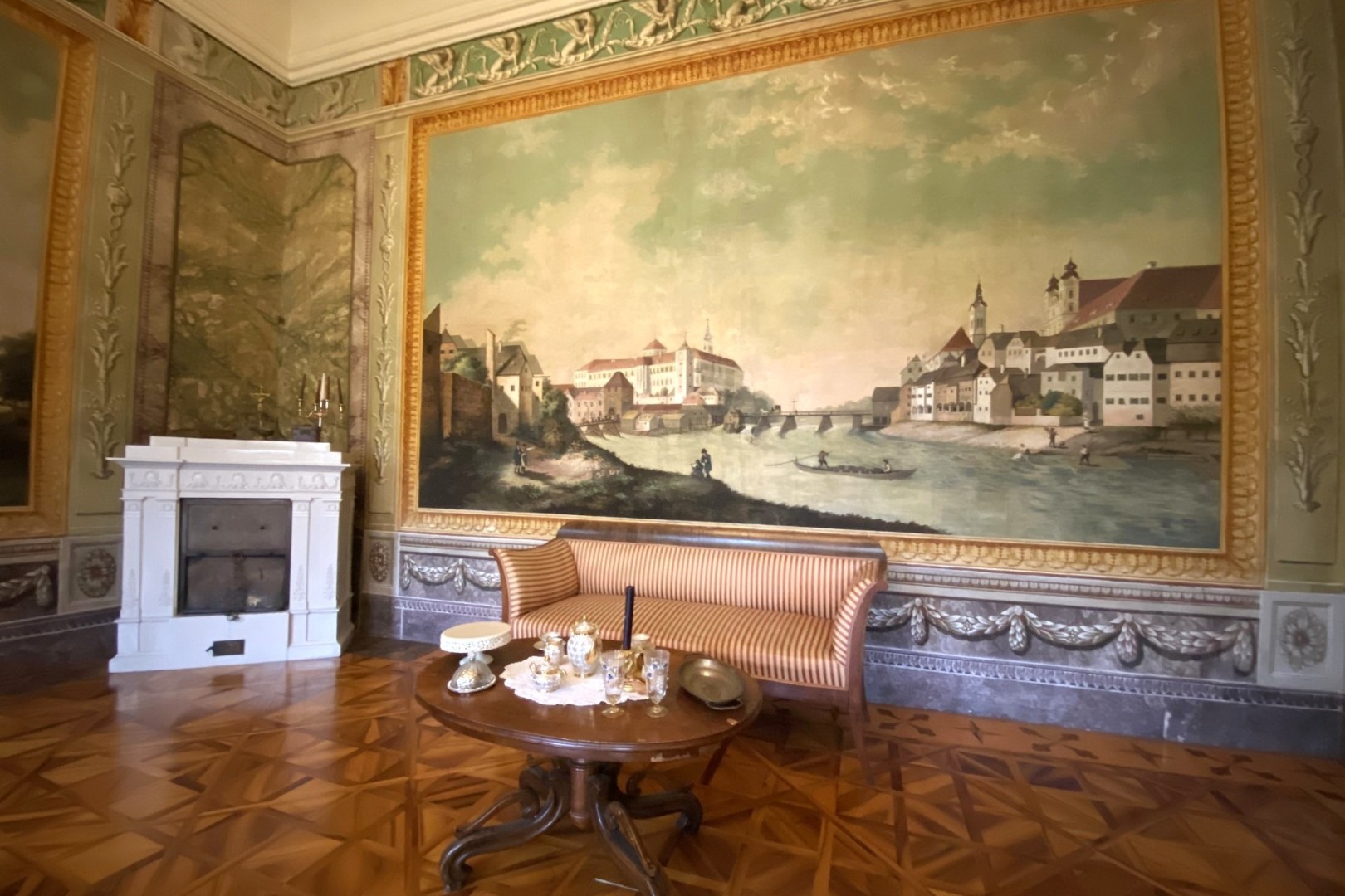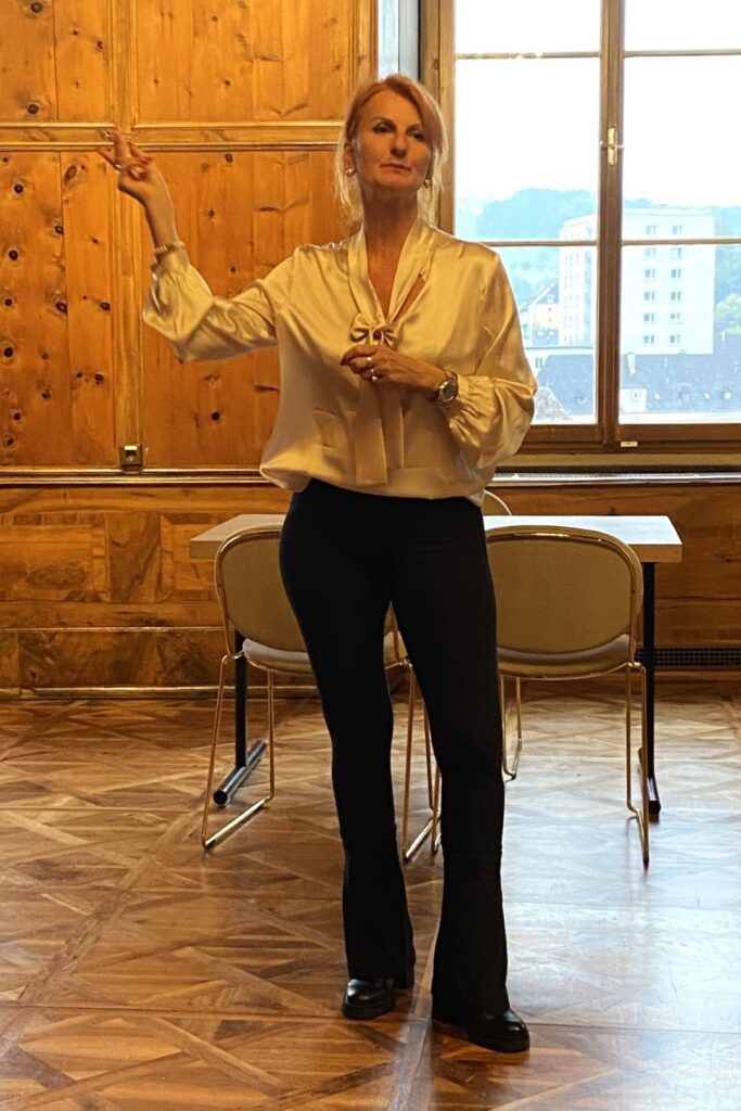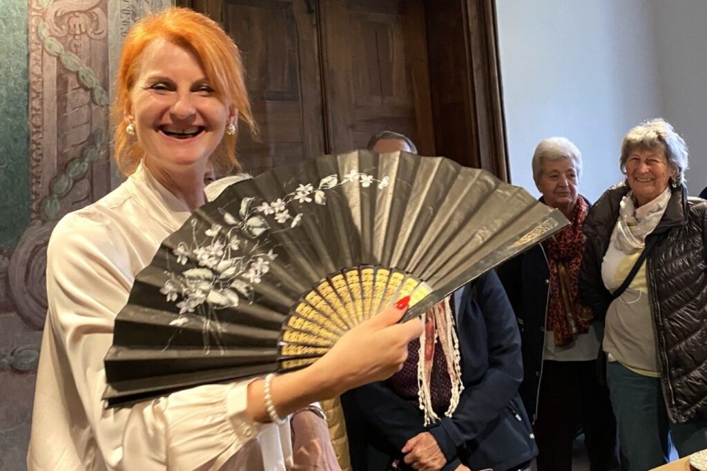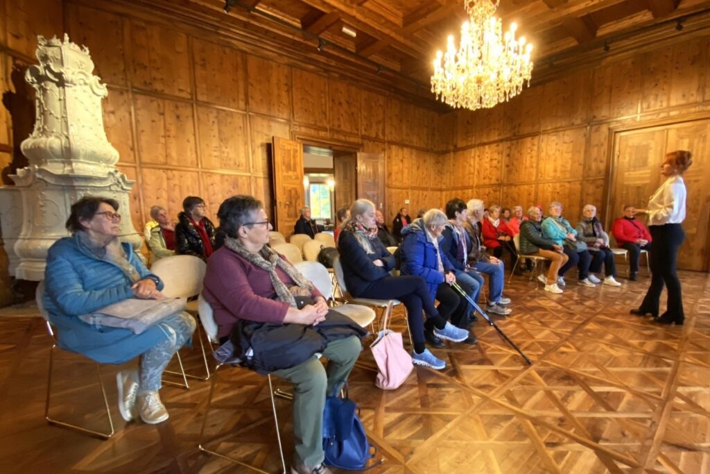 Mit ihrer lebendigen, humorvollen Art zu erzählen und mit ihrer aparten Erscheinung zog die Führerin im Schloss Lamberg die Senioren in ihren Bann. Beim Rundgang durch die prunkvollen Gemächer erzählte sie so manche skurrile Eigenheit der Schlossbesitzer sowie viele gesellschaftliche Details aus der guten alten Zeit. Beispielsweise benutzten Damen ihre Fächer nicht nur dazu, sich Frischluft zuzufächeln. Mit einem ausgeklügelten System richteten sie versteckte Botschaften an die Herren.
