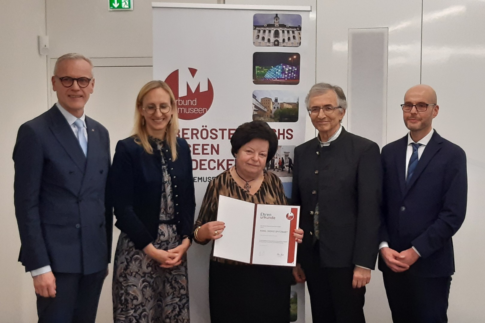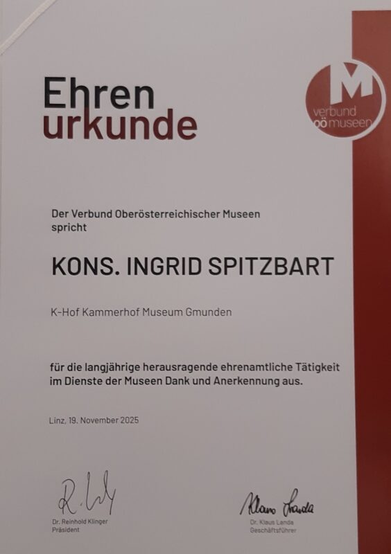 Am Mittwoch, den 19.11.2025 wurde Frau Konsulentin Dir. i. R. Ingrid Spitzbart im Keine-Sorge-Atrium der OÖ Versicherung vom Verbund der OÖ Museen mit einer Urkunde geehrt.