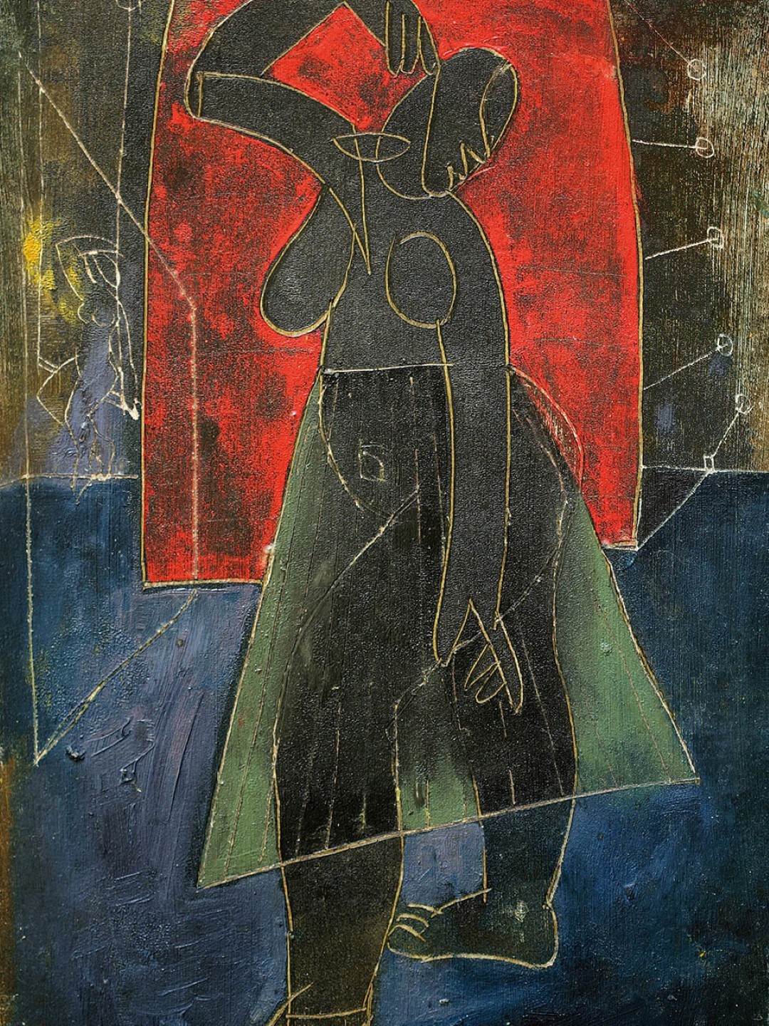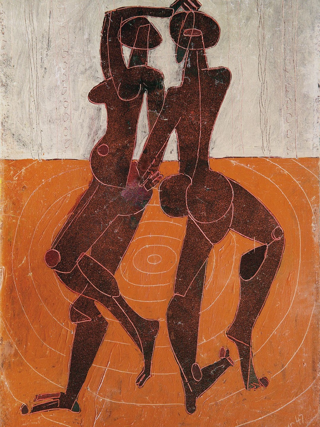Seine Arbeiten glühen vor Energie, sei es in den Tänzerinnenbildern, in die sich jede Drehung und jeder Sprung in fließender Dynamik überträgt, oder in seinen sensiblen Aktdarstellungen, in denen der menschliche Körper in seiner rohen und direkten Präsenz sichtbar wird. Beide Motivgruppen – Tanz und Akt – spiegeln Dachingers Faszination für den menschlichen Körper, seine Formen, Bewegungen und Ausdruckskraft wider. Er entwickelte eine einzigartige Technik des Ritzens und Gravierens, die er in seine Malerei einbrachte. Durch dieses gezielte Einritzen von Linien und Formen entstehen zusätzliche Ebenen, subtile Lichteffekte und eine narrative Tiefe, die seinen Figuren eine außergewöhnliche Präsenz verleihen. Diese Ritzspuren lassen die Bewegung lebendig werden, eröffnen Räume zwischen Realität und Imagination und verstärken die emotionale Wirkung seiner Arbeiten.