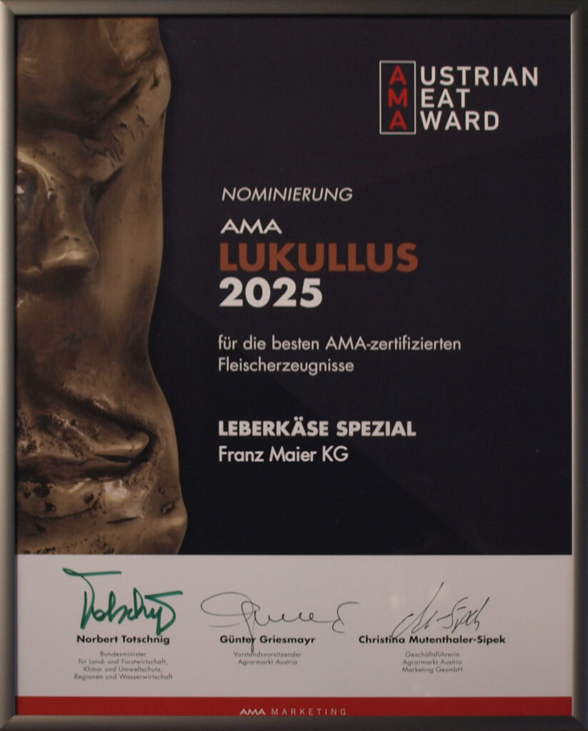 „Wir bieten unseren Kunden Wurst- und Fleischwaren von besonders hoher Qualität. Die Nominierung unseres Leberkäses für den AMA-Lukullus macht uns sehr stolz und beweist ein Mal mehr unseren hohen Qualitätsanspruch“ betont das Team der Franz Maier KG aus Pöndorf/OÖ.
