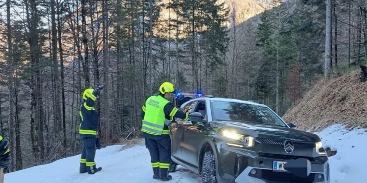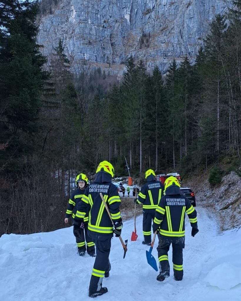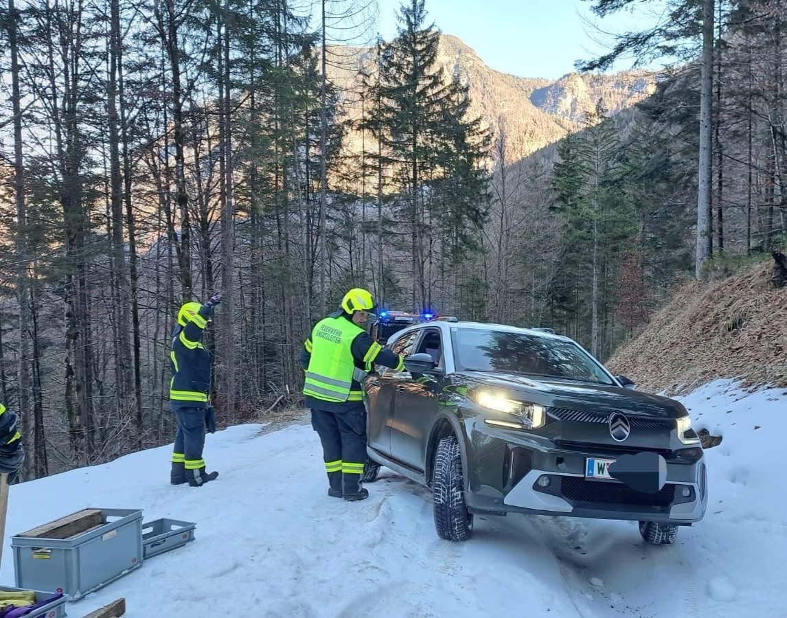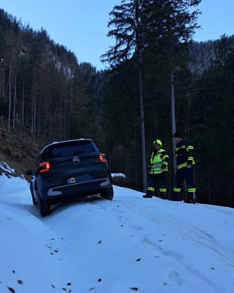 Nachdem sich die Feuerwehr mit dem Rüstfahrzeug den Weg durch die Schneebuckel gebahnt hatte, konnte der Pkw rasch mittels Seilwinde und Pölzholz geborgen werden. Anschließend wurde das Fahrzeug sicher zu einem Parkplatz verbracht, berichtet die FF Obertraun.