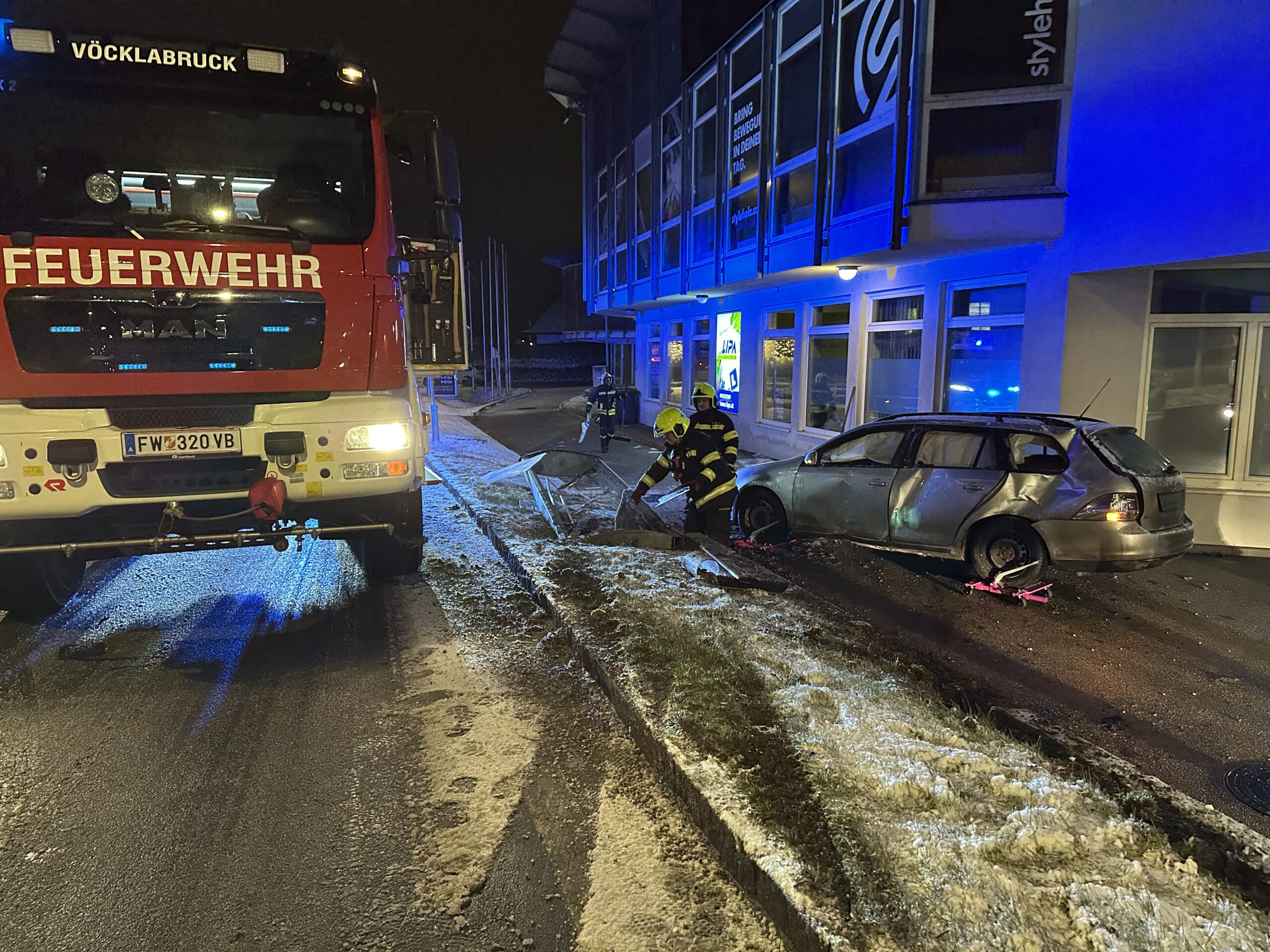 Nach einem Verkehrsunfall auf rutschiger Fahrbahn wurde die Feuerwehr Vöcklabruck am Weihnachtsabend alarmiert. Ein Pkw kam von der Straße ab und landete im Eingangsbereich einer Fahrschule.