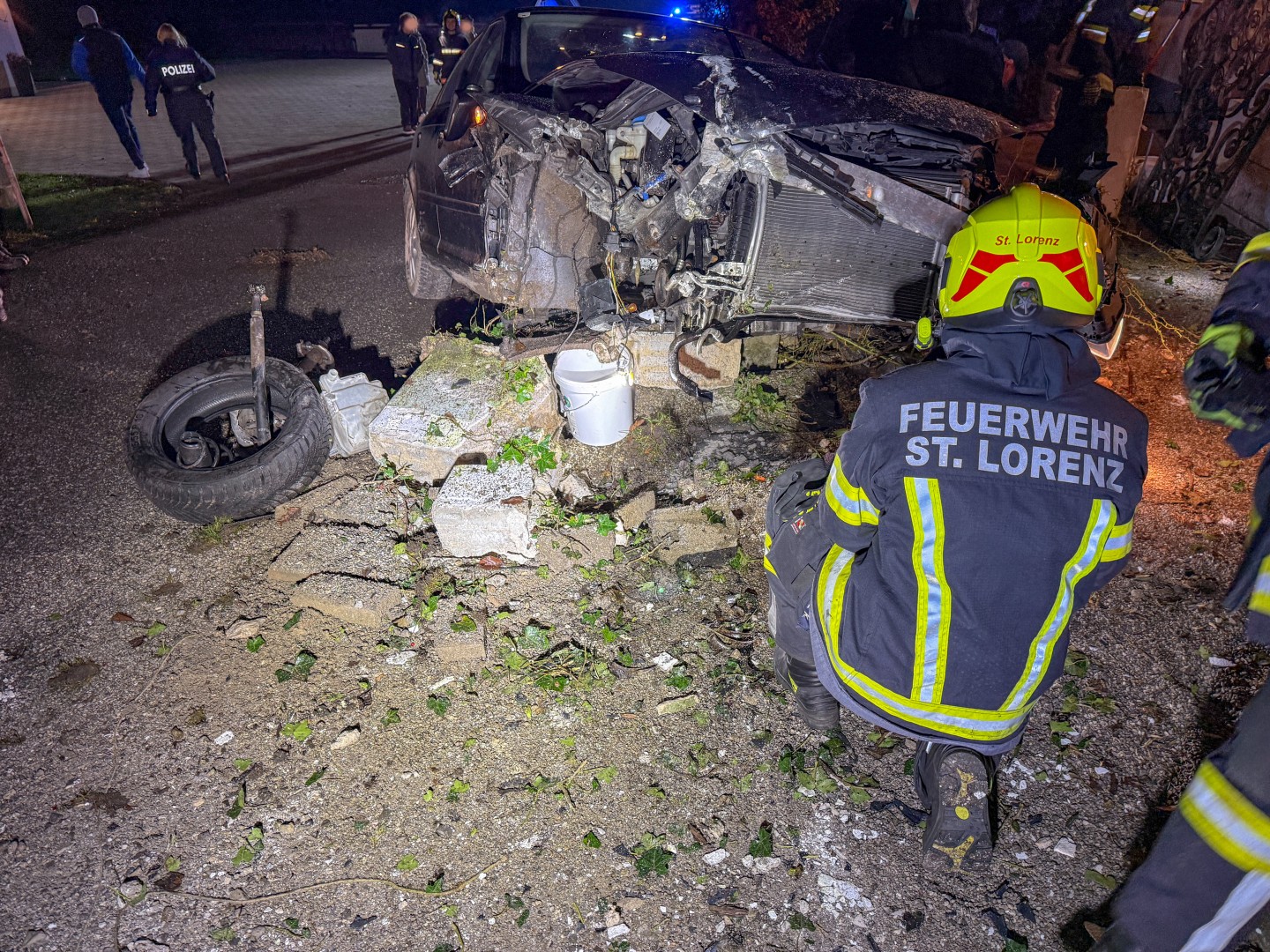 Am Samstag wurde die Freiwillige Feuerwehr St. Lorenz um 23:17 Uhr zu einem Verkehrsunfall gerufen. Ein voll besetzter PKW war gegen eine Mauer gerkracht.