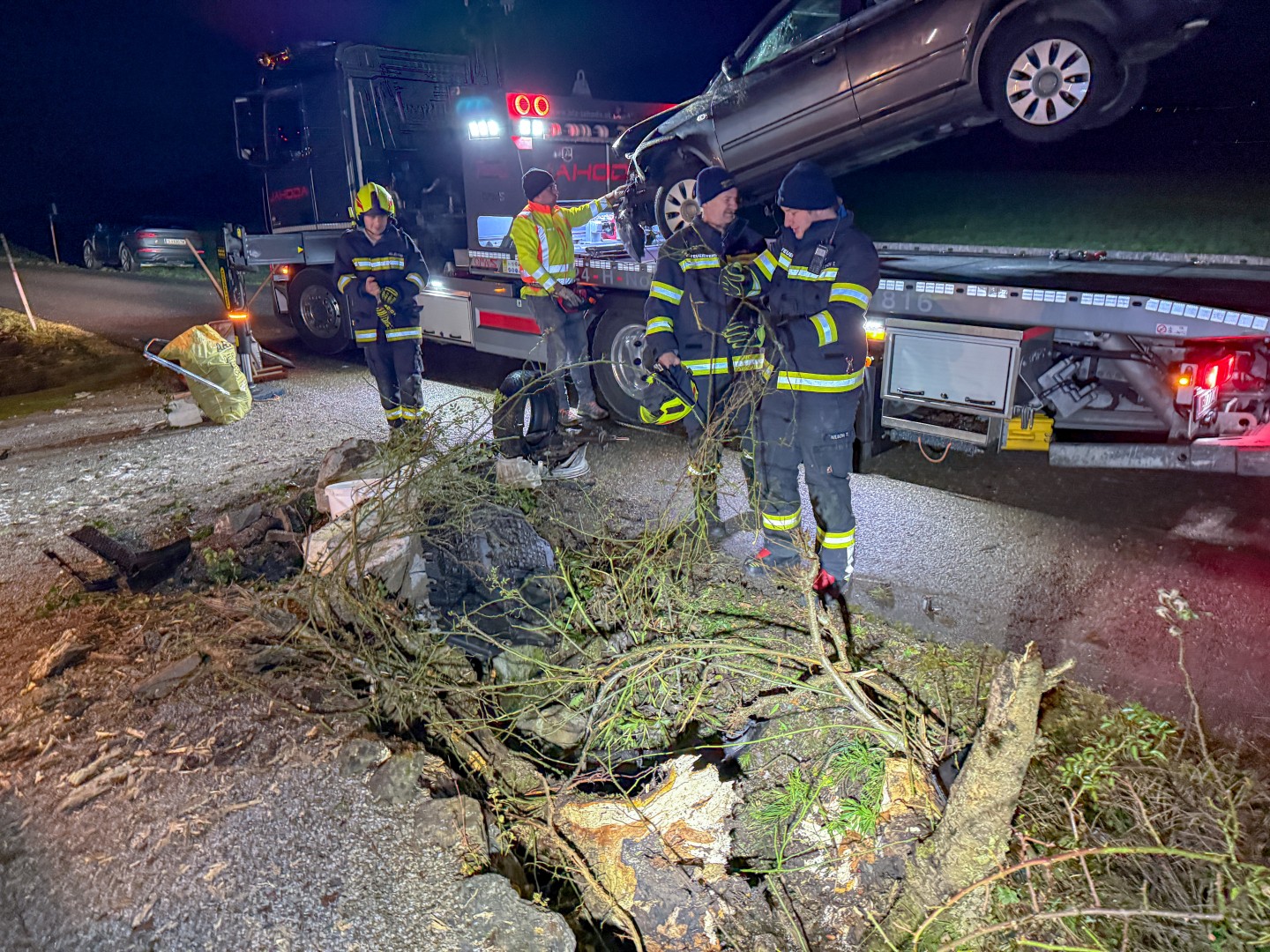 Einsatzleiter Wolfgang Schachl berichtet von der Lage beim Eintreffen: „Ein mit fünf Jugendlichen besetzter PKW war am rechten Fahrbahnrand in eine Gesteinsmauer gekracht, hob ab und flog auf die andere Straßenseite, dort wurde eine Gartenmauer und ein Baum umgerissen. Alles fünf Insassen konnten sich selbst befreien.“