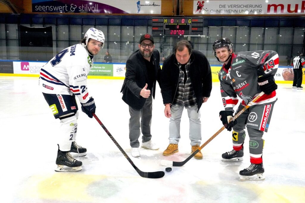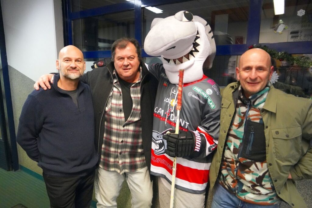 Es gab aber auch ein tolles Treffen mit Urgesteinen der Shark Geschichte. Den Puckeinwurf machte der Obmann der Sharks Günter Kail und kein geringerer als Josef CHABRON, damaliger tschechischer Starstürmer der Traunsee Sharks der auch im tschechischen Nationalteam eingesetzt war und in Gmunden den Eishockeysport ab 1984 so richtig in Aufschwung brachte. Josef Chabron erzielte damals in 14 Meisterschaftsspielen 98 Tore! Beim heutigen Puckeinwurf gab es ein kräftiges HAPPY BIRTHDAY zum 70. Geburtstag für ihn. Dazu gratulierten auch der damalige Teamchef Robert Rastinger, einer der ältesten Fans Walter Oberleitner und auch Gerhard Holleis, der damals die Eismaschine lenkte. Auch der Präsident des OÖ Eishockeyverbandes Christian „Ladi“ Ladberg und VizeBgm Wolfgang Schlair konnte unter den Gästen begrüßt werden.