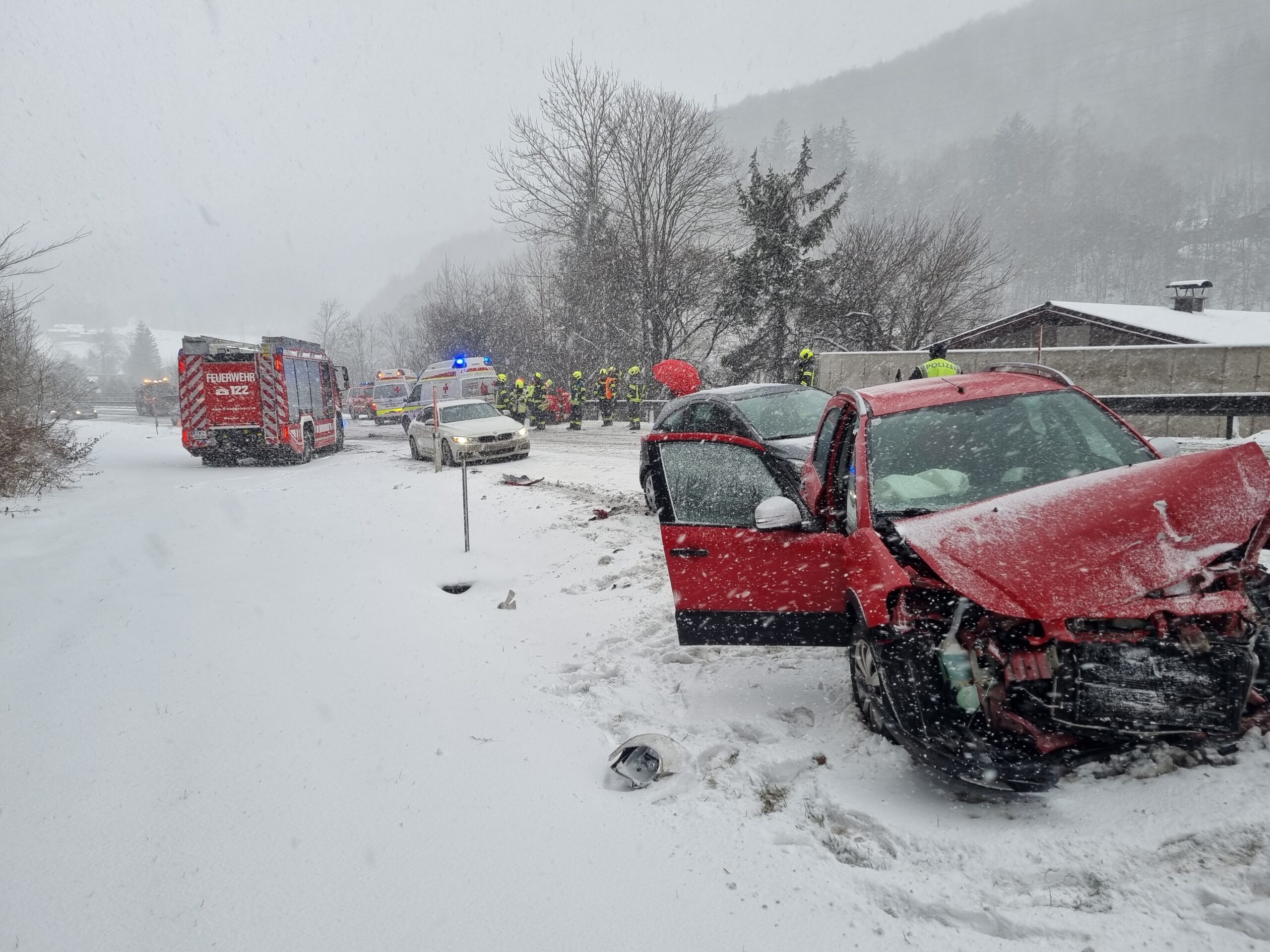 Dienstagmittag wurden die Feuerwehren Lauffen, Bad Ischl, Pfandl und Bad Goisern zu einem Verkehrsunfall mit Personenrettung nach Lauffen alarmiert. Bei einer Kollision in einer Kurve der B145 stießen insgesamt drei Fahrzeuge zusammen.