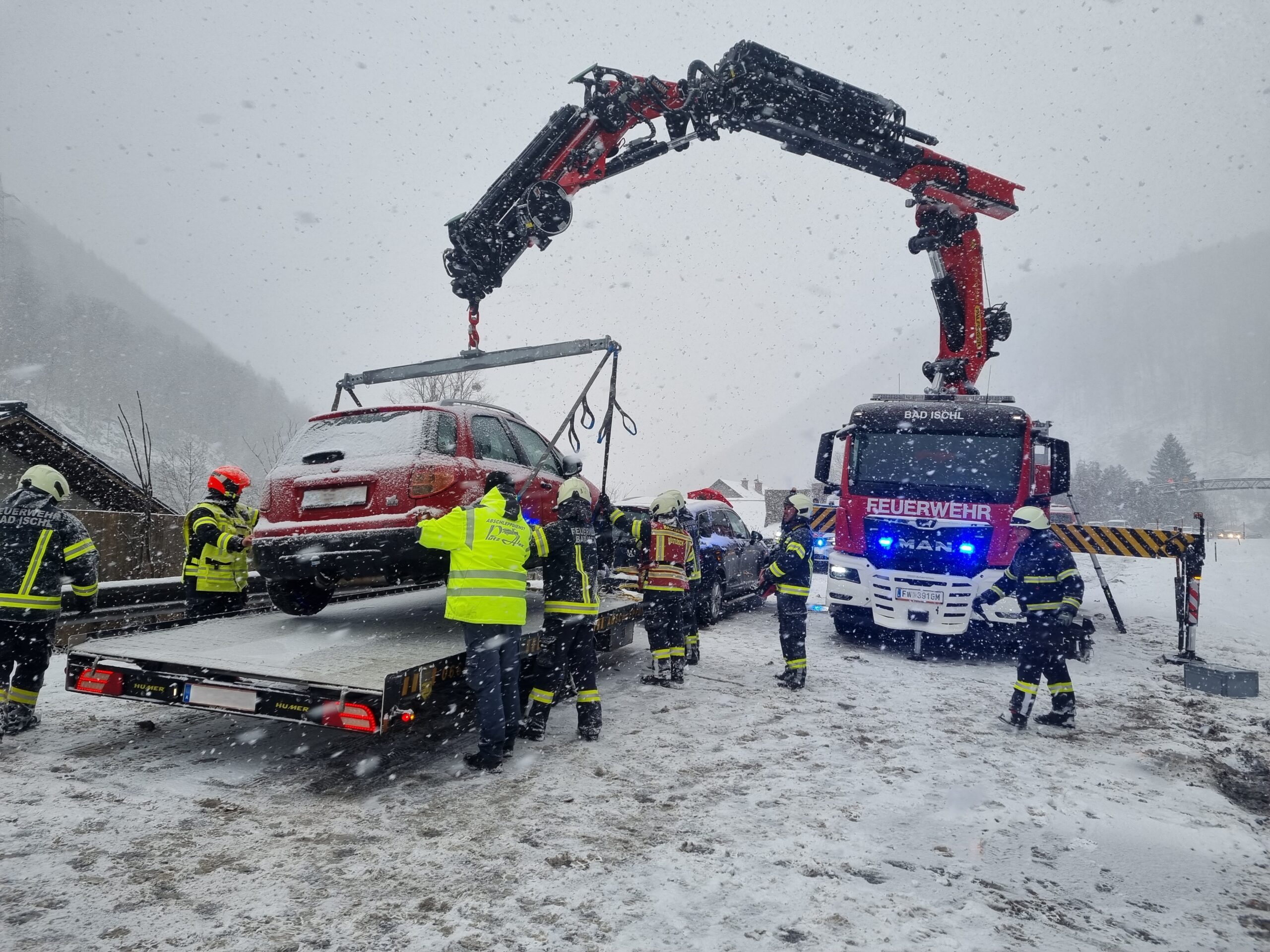 Mit dem Kran von „WLF Bad Ischl“ wurden zwei Fahrzeuge von der Unfallstelle gehoben und an ein Abschleppunternehmen übergeben. Das dritte Auto wurde beim Crash nur leicht beschädigt und konnte weiterfahren.