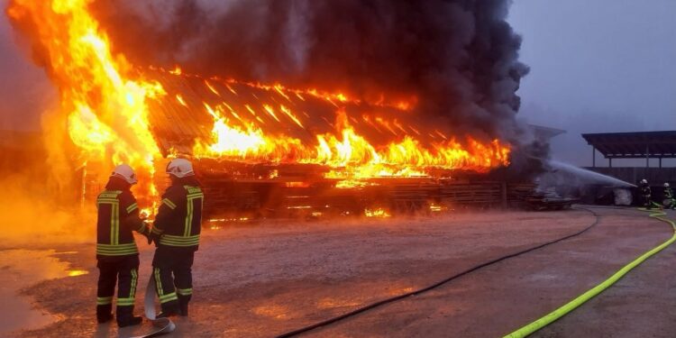 In Kirchham ist es heute Nachmittag zu einem Großbrand gekommen. Aus bislang ungeklärter Ursache geriet eine Lagerhalle, in der Holz, Holzspäne und Maschinen gelagert waren, in Brand. Das Gebäude brannte vollständig aus.