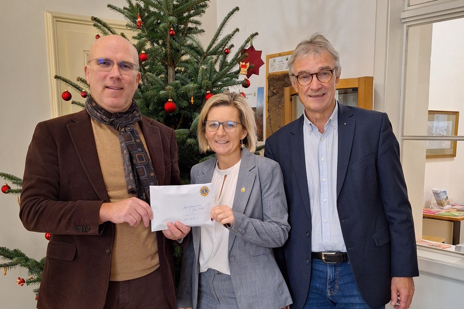 Lions Präsident Christof Kravutske (links) und Vizepräsident Alfred Reimair konnten Bürgermeisterin Ines Schiller mehr als zwei Dutzend Lebensmittelgutscheine überbringen, die hoffentlich etwas Vorweihnachtsfreude in manchen benachteiligten Haushalt bringen werden.