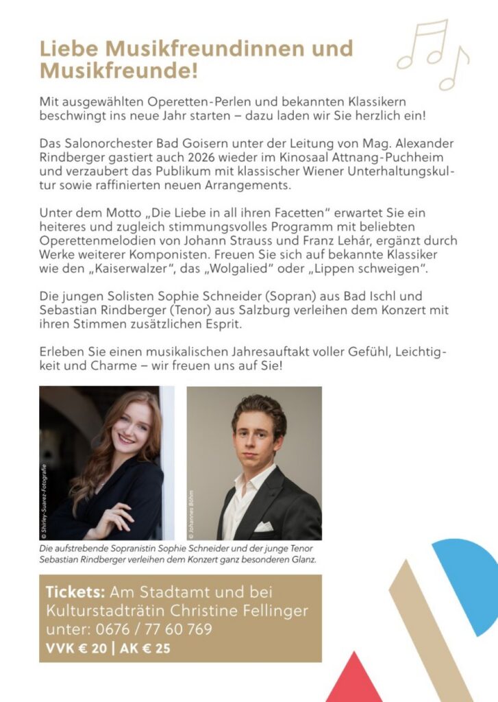 Das Konzert ist ein musikalischer Jahresauftakt, der Tradition mit stilvoller Unterhaltung verbindet – ein festlicher Rahmen, der den kulturellen Jahresbeginn in Attnang-Puchheim besonders macht.
