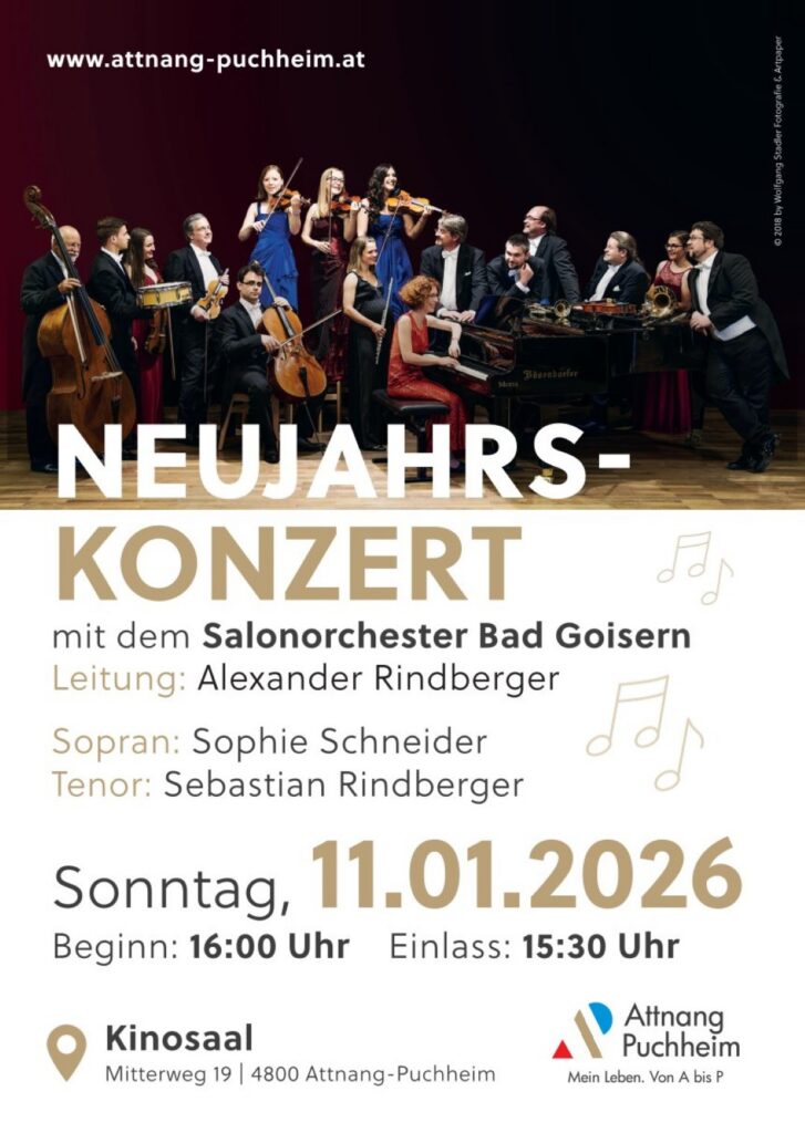Wir laden Sie herzlich zum Neujahrskonzert 2026 mit dem SALONORCHESTER BAD GOISERN der Stadt Attnang-Puchheim ein, das am Sonntag, 11. Jänner 2026, um 16:00 Uhr im Kinosaal über die Bühne geht.