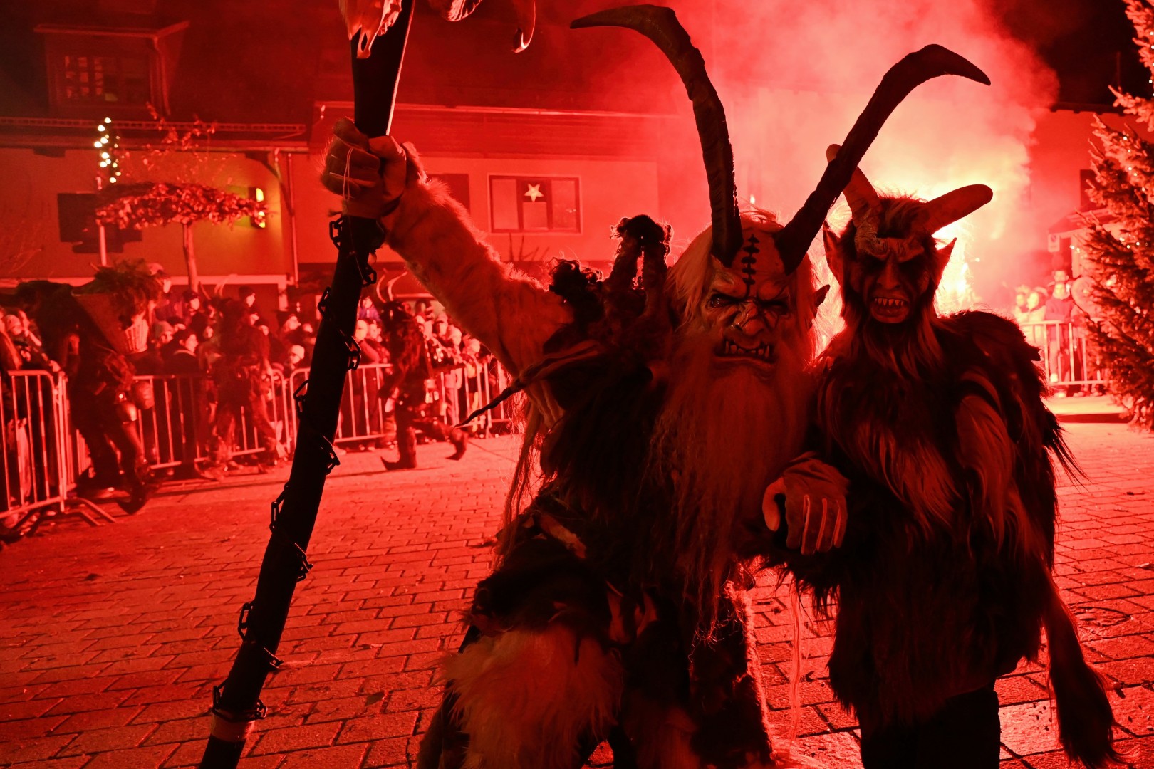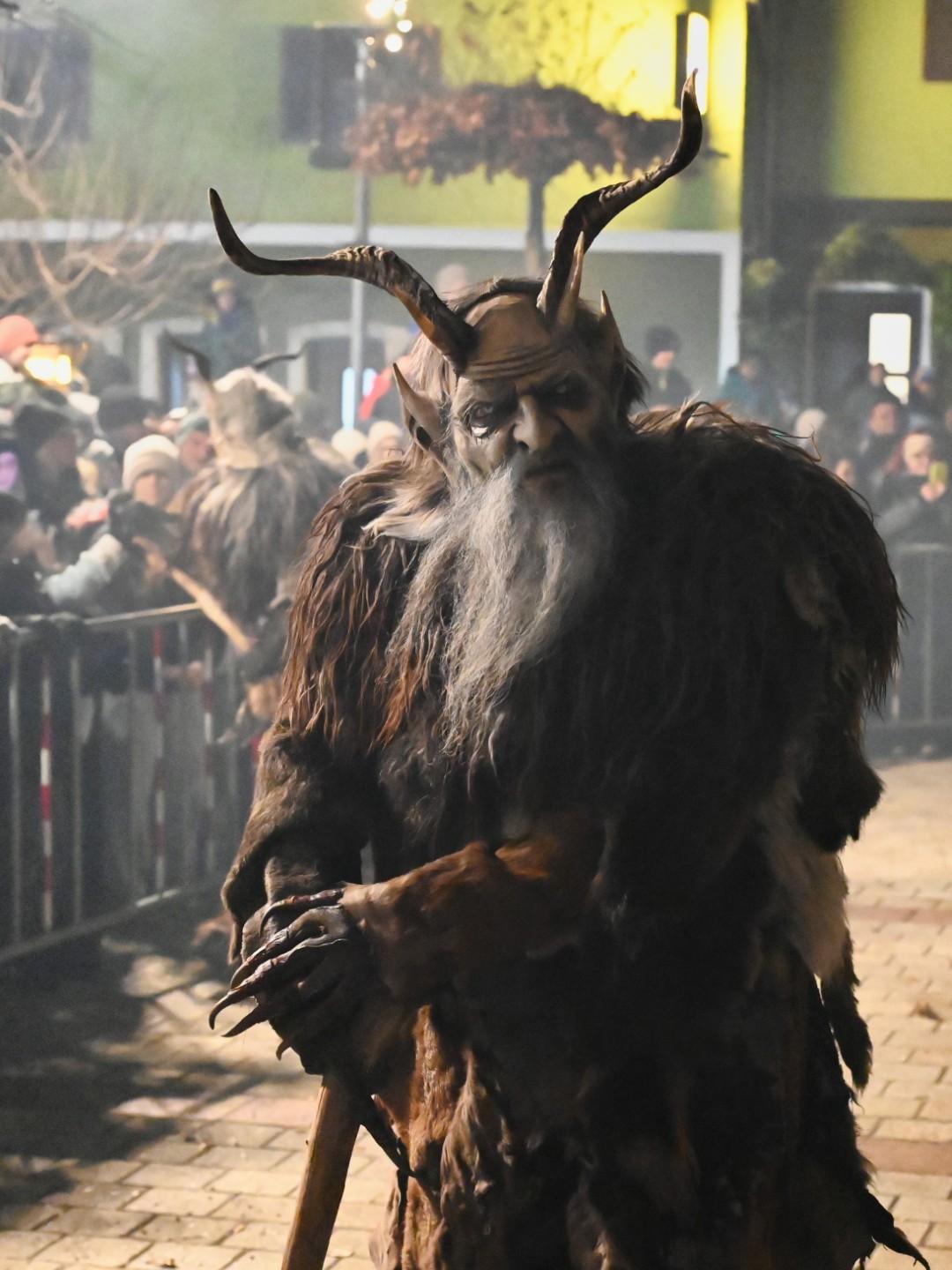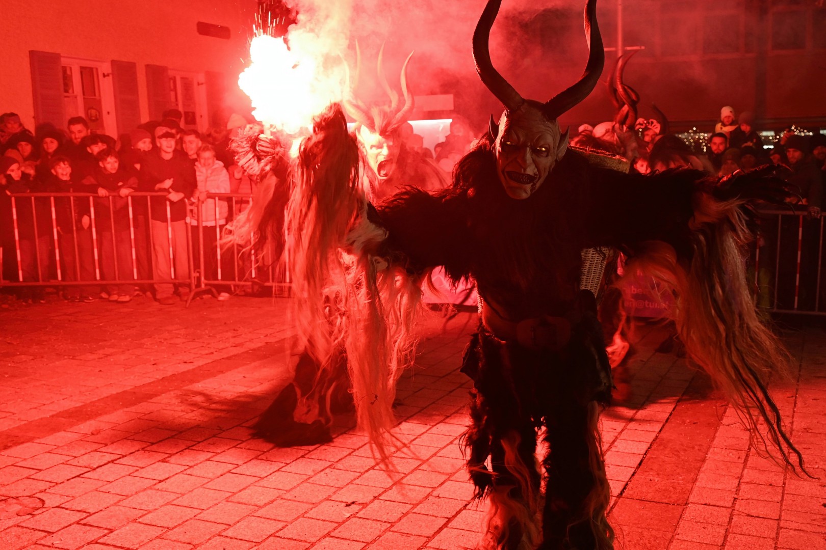 Nachdem die Kinder ihre Gaben erhalten hatten, verwandelte sich das Ortszentrum in eine spektakuläre „Höllenshow“. Sprecher Christian Pumberger bedankte sich zunächst bei den Sponsoren und sprach anschließend eindringliche und mahnende Worte an die Besucher: „Bitte die Perchten niemals an den Hörnern ziehen, dies kann sehr schwere Verletzungen verursachen!“