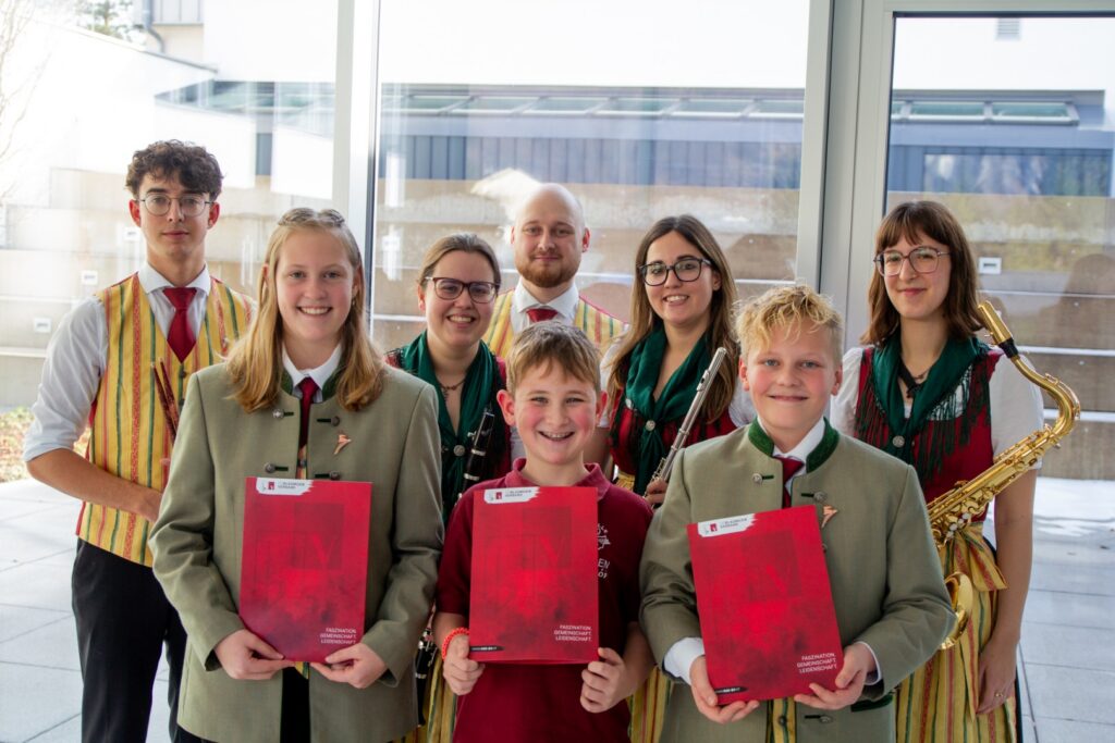 Auch der Gmundner Bürgermeister Mag. Stefan Krapf gratulierte den neuen Leistungsabzeichenträger:innen persönlich. Mit dem bronzenen Leistungsabzeichen haben Selina und Dominik Pichelsberger zugleich den Übertritt in das Vereinsorchester der Werkskapelle Laufen absolviert. Johannes Hochmair ist bereits ein fester Bestandteil sowohl im Vereinsorchester als auch im Bezirksjugendorchester. Als einer von fünf Musiker:innen der Werkskapelle wirkte er am Verleihungstag im Klangkörper des Bezirksjugendorchesters mit.