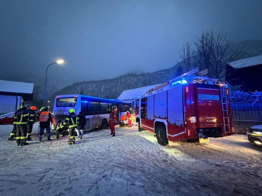 Aufgrund der schneebedeckten Fahrbahn verlor ein Buslenker am Morgen des 08.01.2026 die Kontrolle über sein Fahrzeug und krachte in ein Gebäude am Fuße eines abschüssigen Straßenstücks. Daraufhin wurden die Freiwilligen Feuerwehren Ebensee und Roith mit dem Einsatzstichwort „Personenrettung Verkehrsunfall Autobus“ zu Hilfe gerufen.